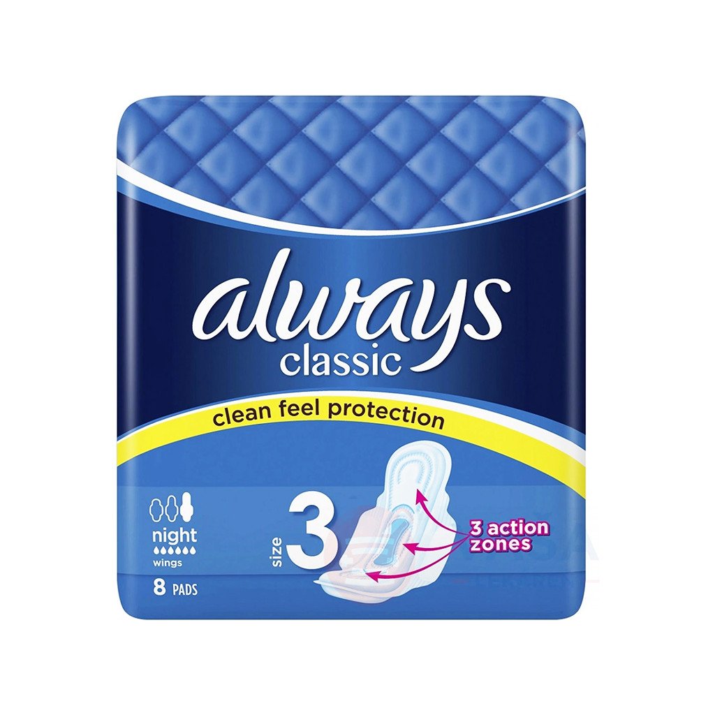 Always Classic Night 8 ks, poskytujú ochranu s pocitom čistoty s 3 funkčnými zónami, vďaka ktorým sa cítite bezpečne po celú noc....