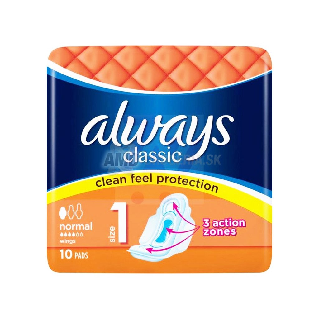 Always Classic Normal 10 ks, sú určené ženám, ktoré chcú mať pri nosení vložiek pocit ich blízkosti k pokožke. Tieto vložky sú hrubšie ako vložky Ultra, poskytujú však rovnako úžasnú ochranu. Rozmer (cm)