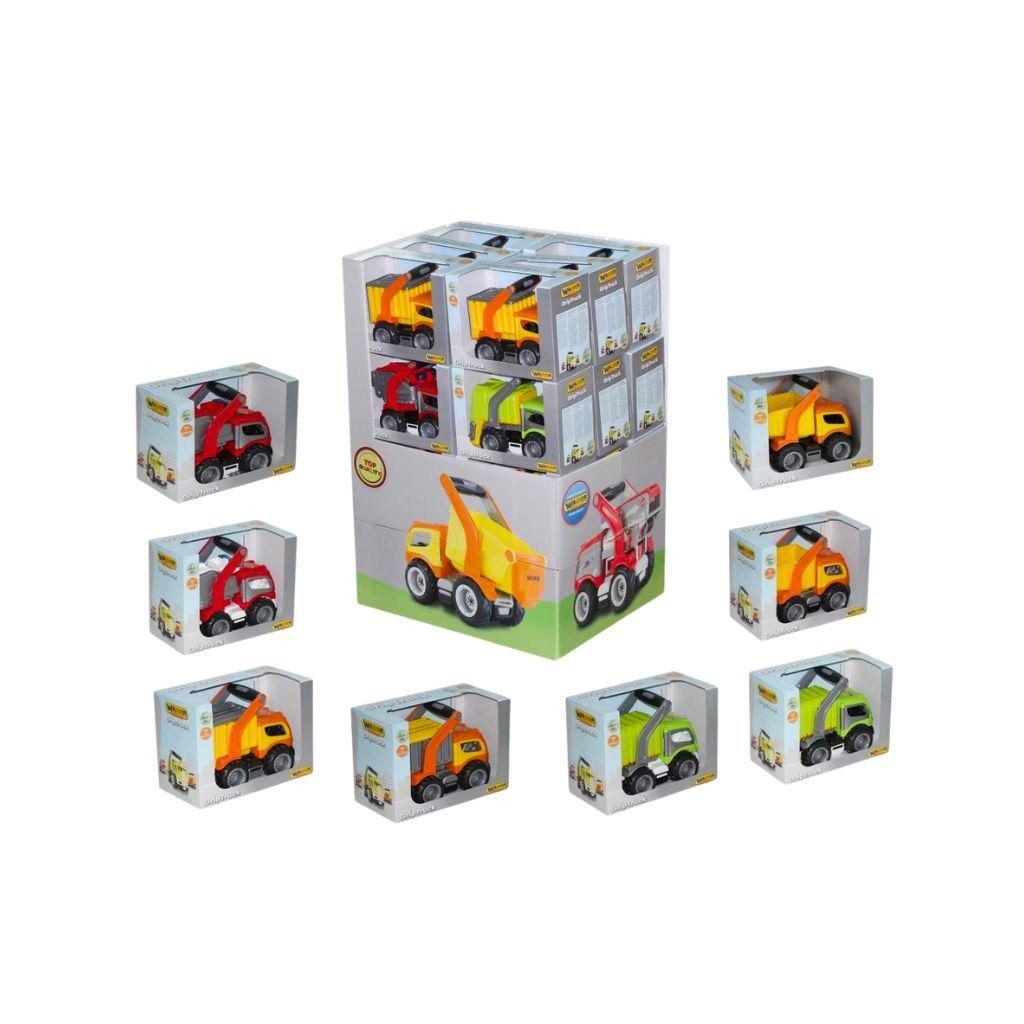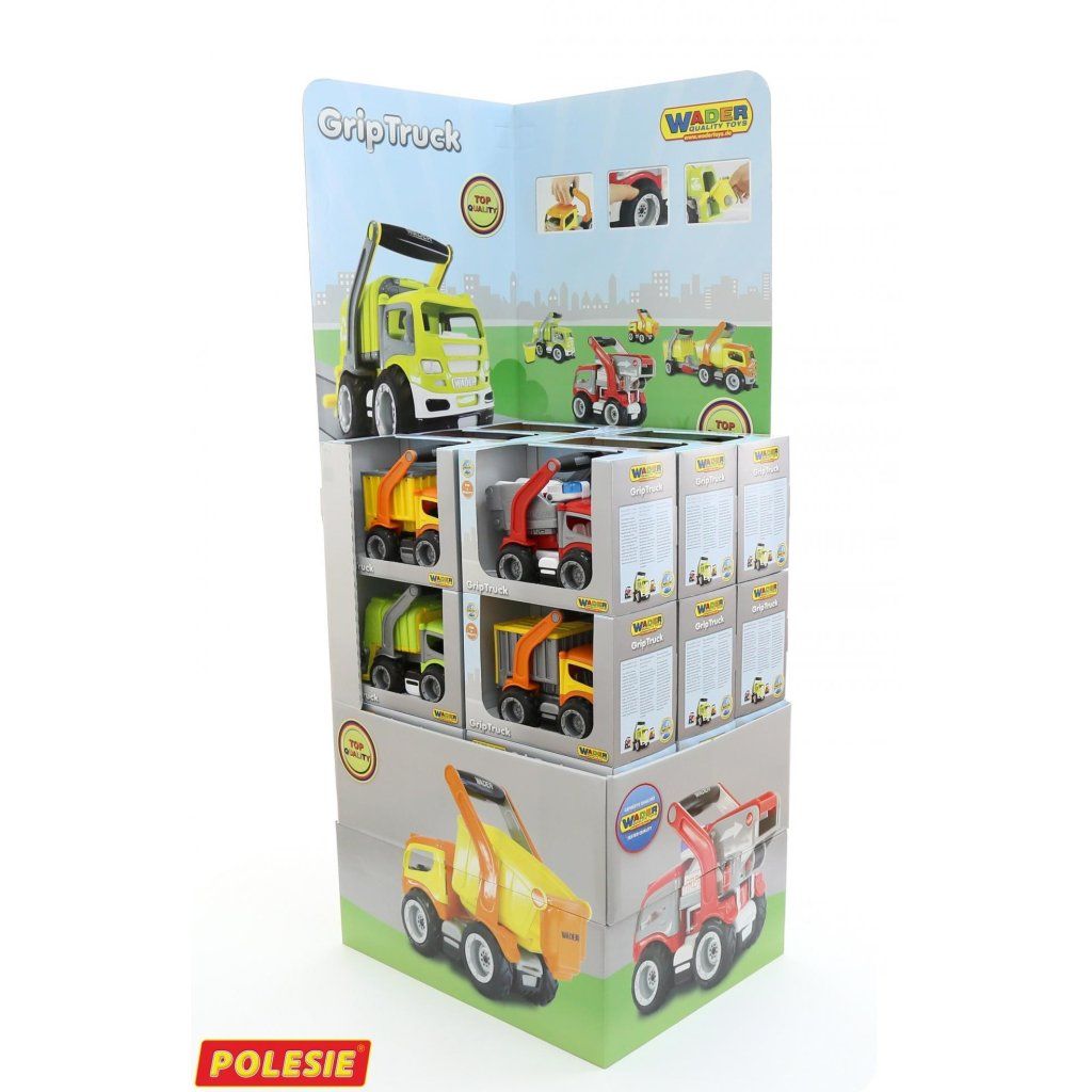 Auto GripTruck je robustné pracovné vozidlo s veľkými kolesami s výrazným vzorkom, ktoré je vhodné na hry doma aj vonku. Vozidlá majú otvárateľné dvere kabíny a pogumované madlo nad korbou, ktoré umožňuje jednoduché vyberanie nadstavby alebo kontajnera podľa typu vozidla. V ponuke sú rôzne varianty ako sklápěč, kontajnerové auto, hasičské auto s výsuvným rebríkom alebo smetiarske auto s popelnicou a mechanizmom vyklápania. Hra podporuje záujem detí o techniku, rozvíja jemnú motoriku a podnecuje fantáziu pri vytváraní rôznych pracovných situácií. Cena je uvedená za jeden kus. Rozmer (cm)