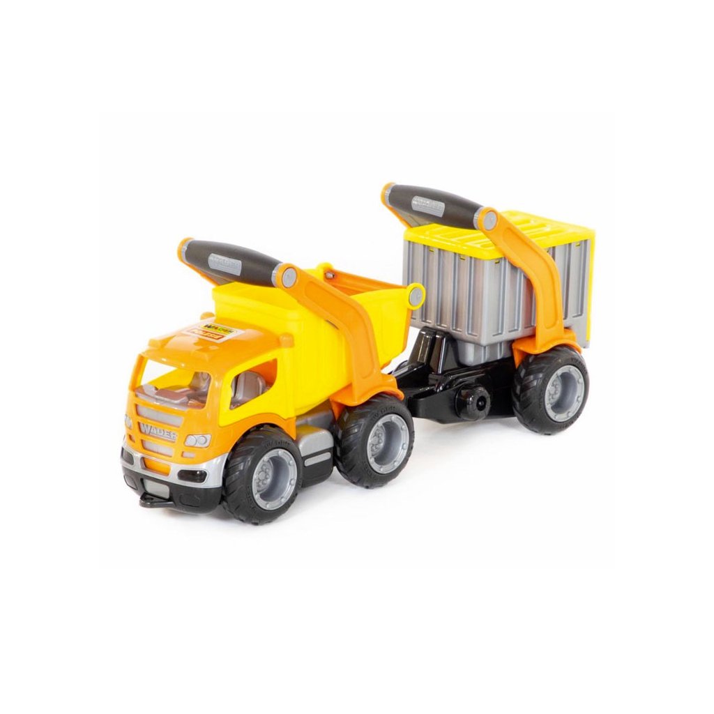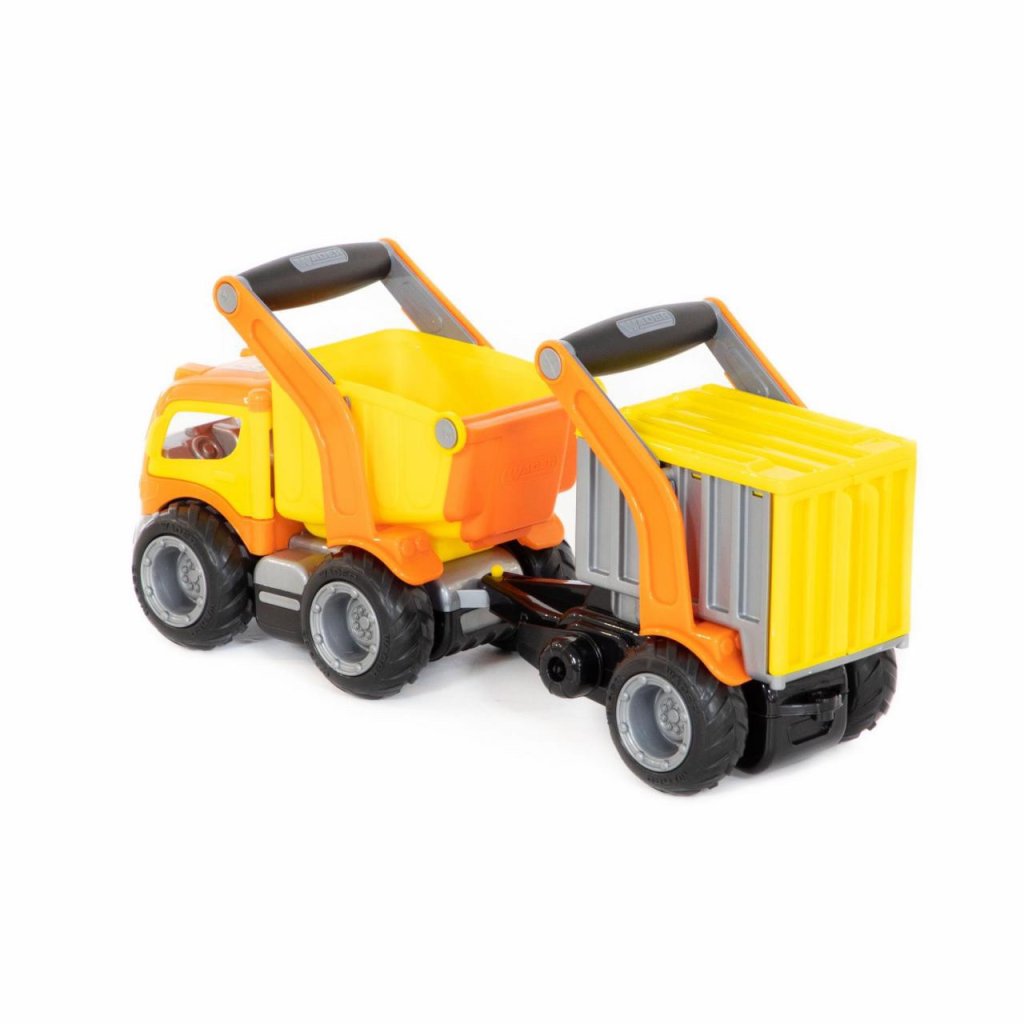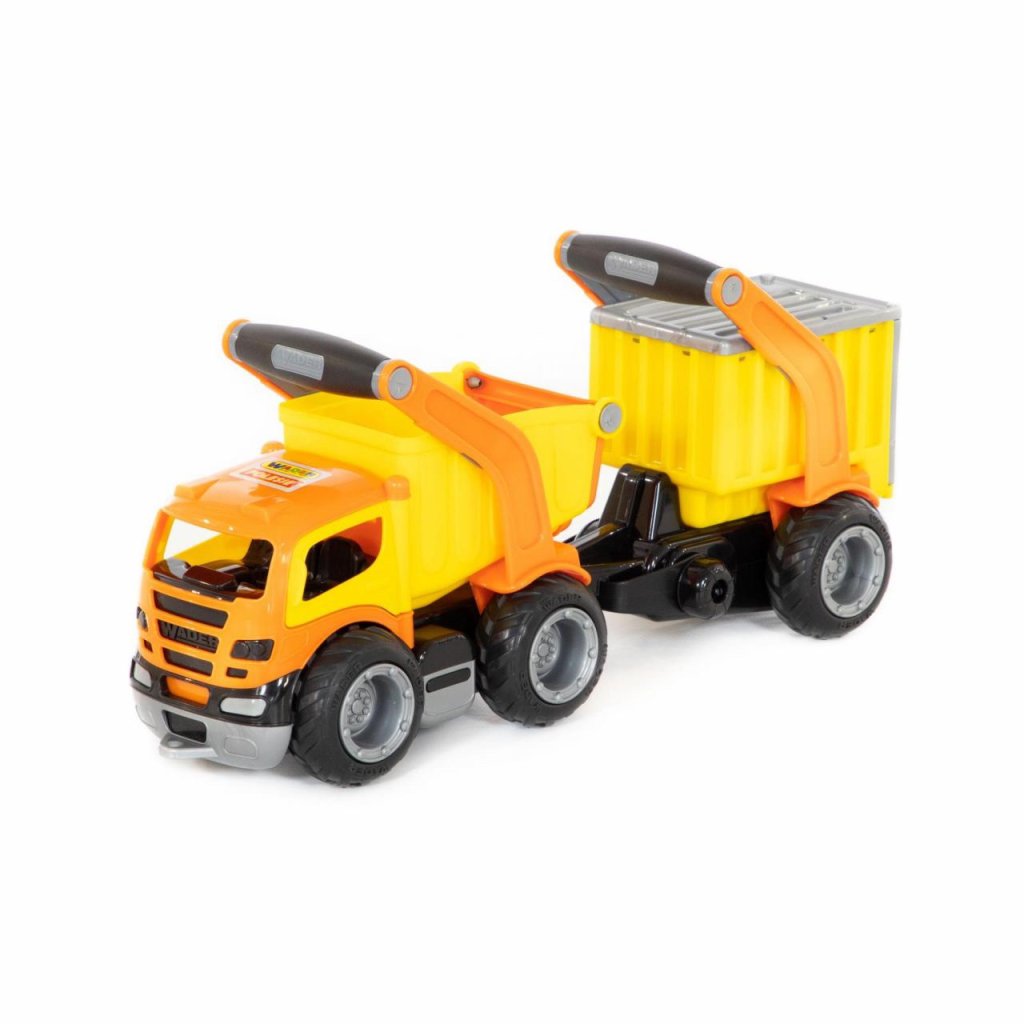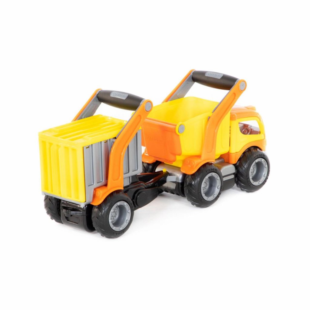 Auto Gripp Truck vyklapacie s návesom je vyrobené z pevného plastu, je 44 cm dlhé, bez pohonu, s korbu je možné vyklápať do zadu, zadné čelo je pohyblivé, kontajner na návese je možné vzadu otvoriť. Hračky série Gripp sú vyrobené tak, že jednotlivé nástavby môžete jednoducho zložiť, resp vymeniť navzájom. Auto aj náves je vybavené gumovými pneumetikami. Rukoväte sú tiež z gumového materiálu. Hračka je vyrobená v triede Wader quality toys. Rozmer (cm)