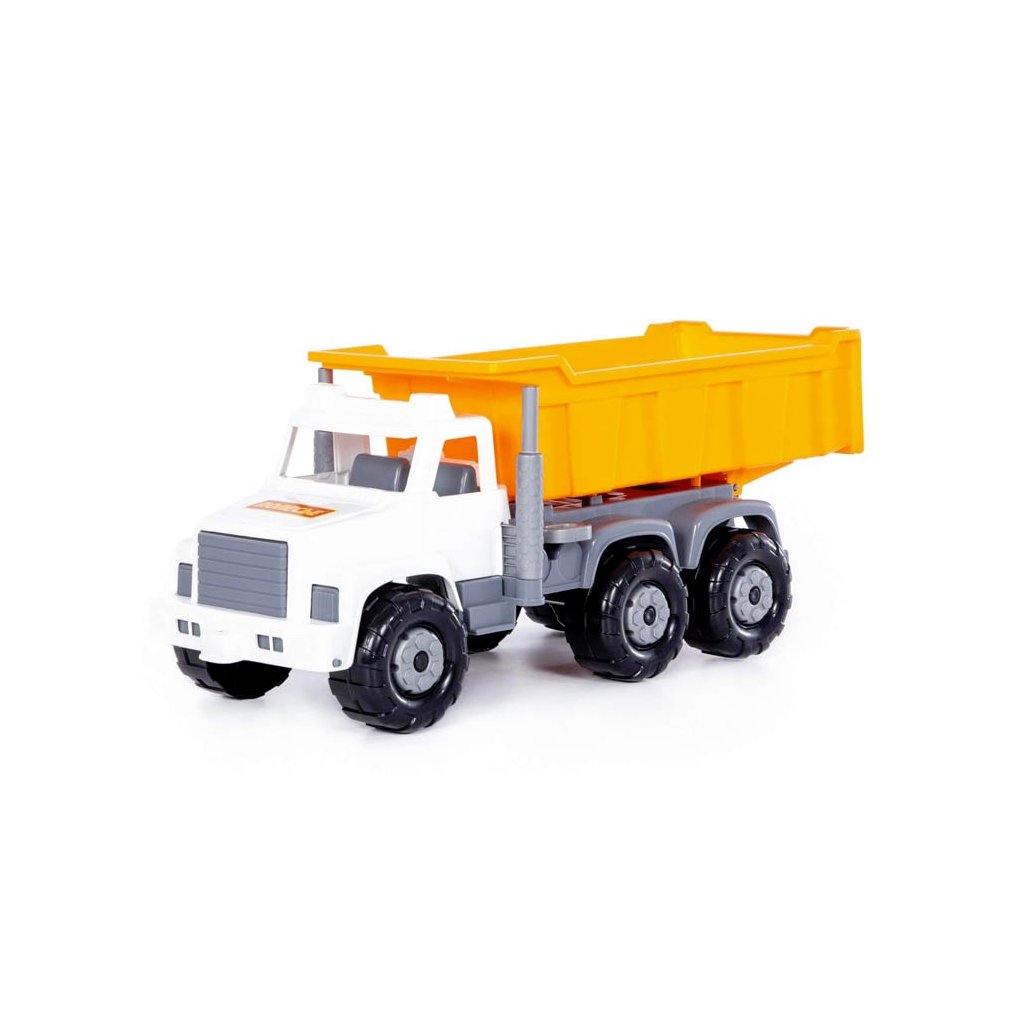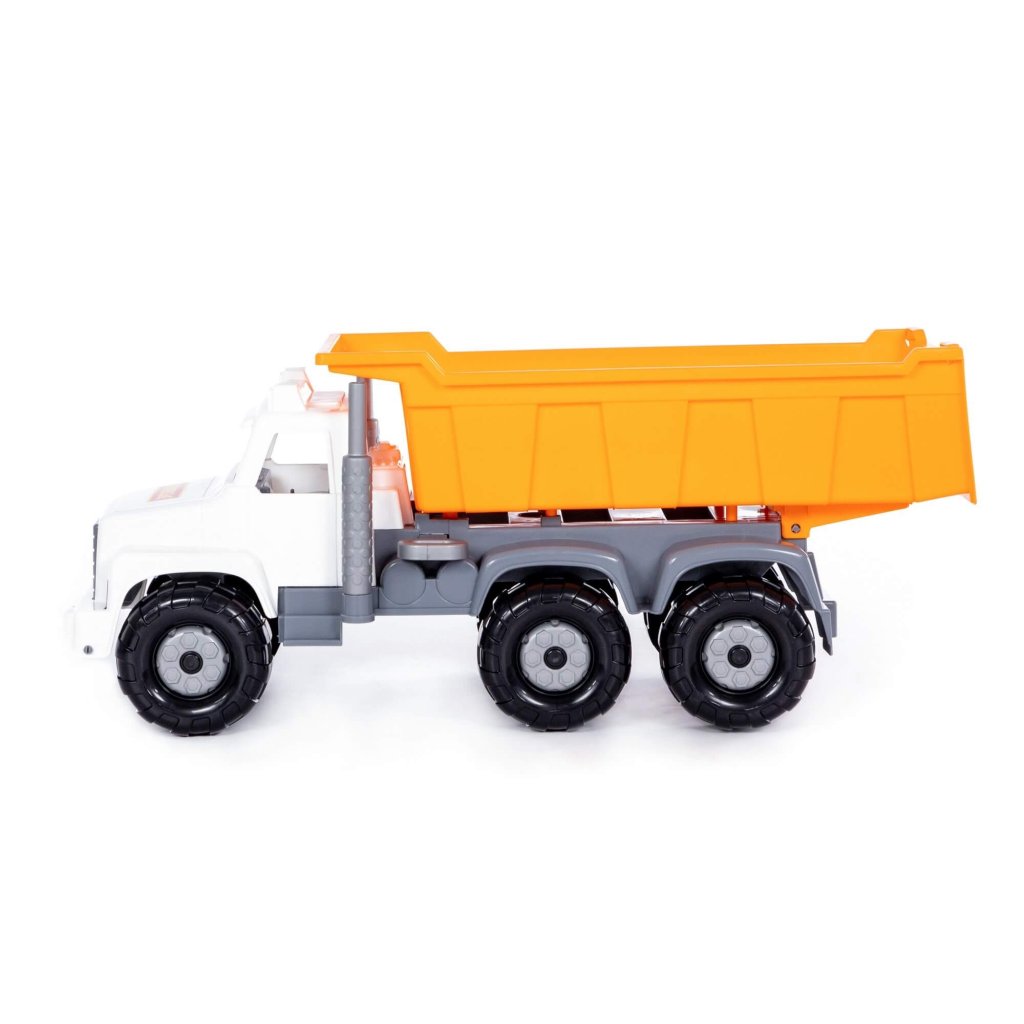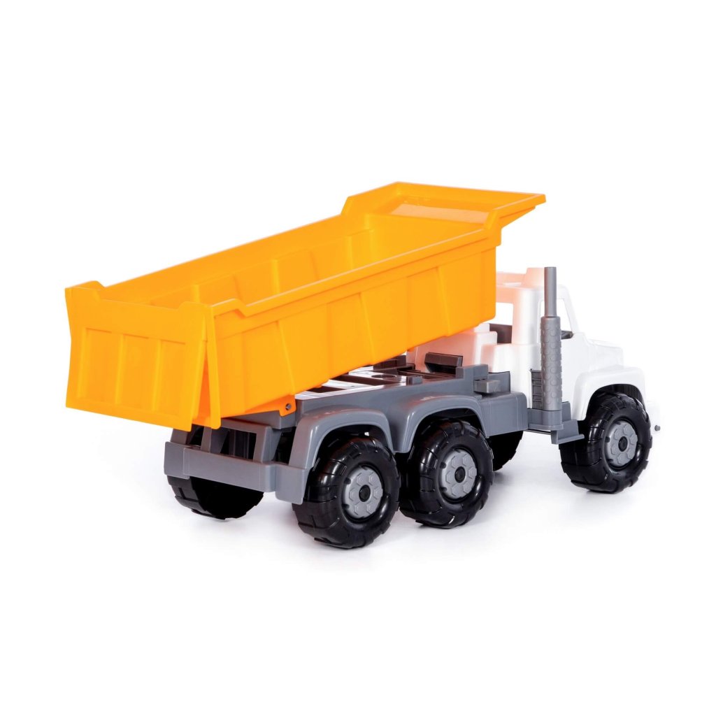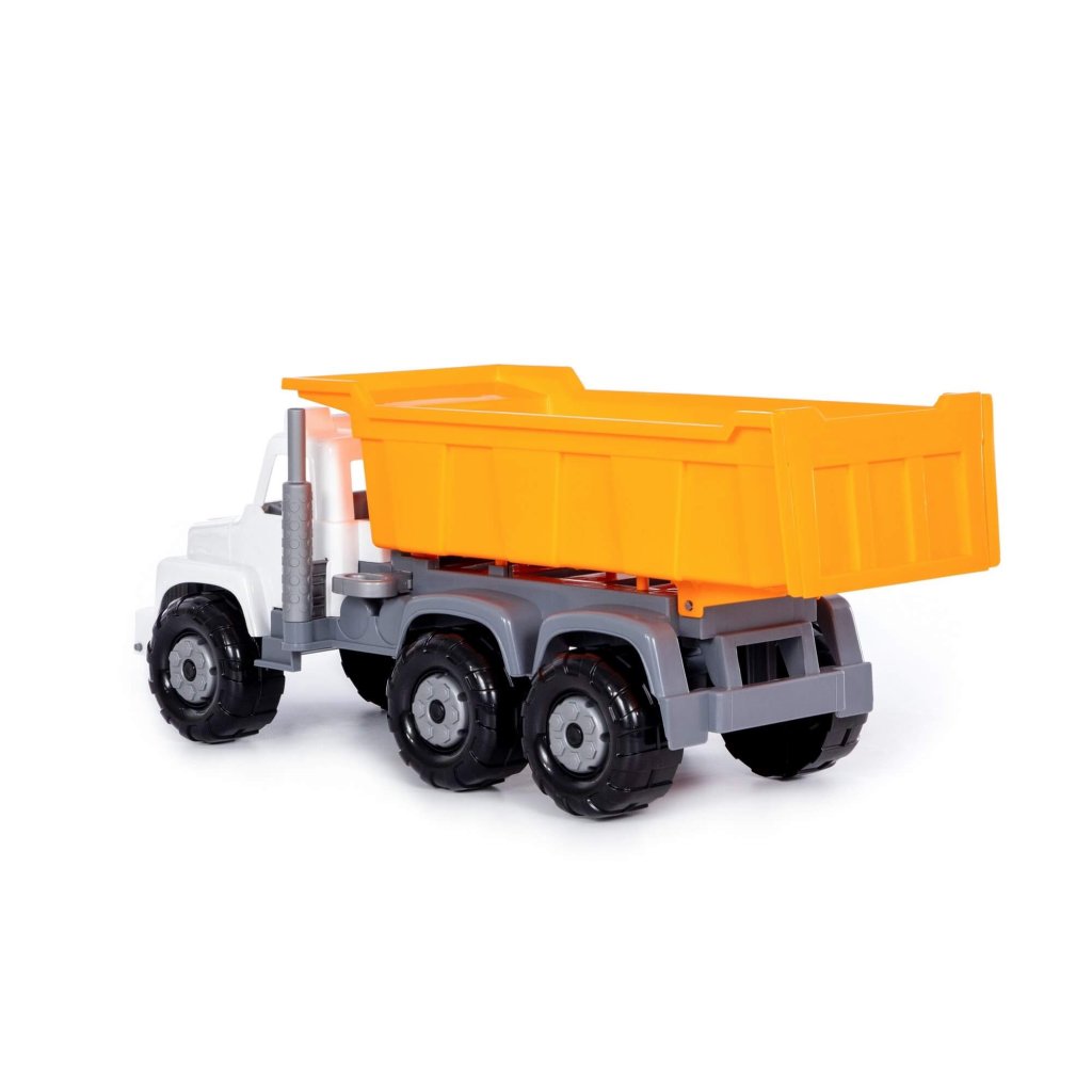 Nákladné auto Gigant, vyklápací valník s otváracím zadným čelom, bez pohonu, so zaisťovacou výklopnou kabínou s prístupom k motoru, vhodný na hru do interiéru aj na piesok, certifikovaný pre deti od 3. roku veku. Rozmer (cm)