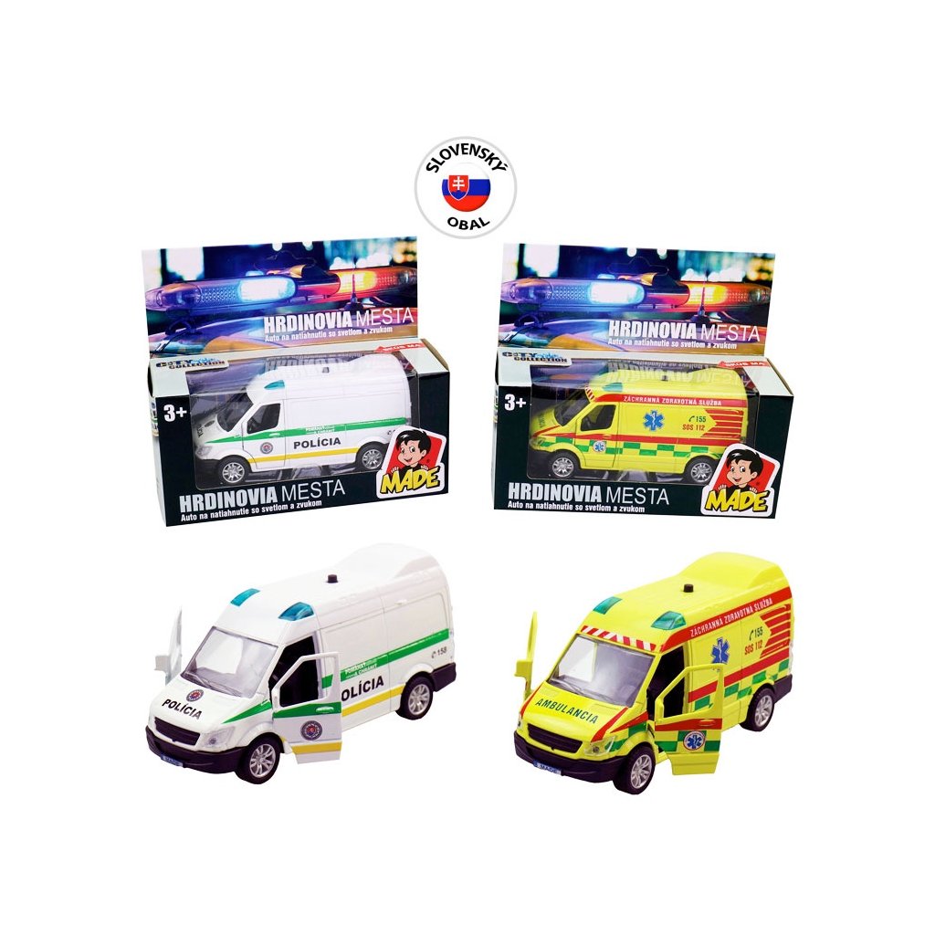 Auto záchranárske na 2 batérie typu LR-41. Autíčko je na spätné natiahnutie.
