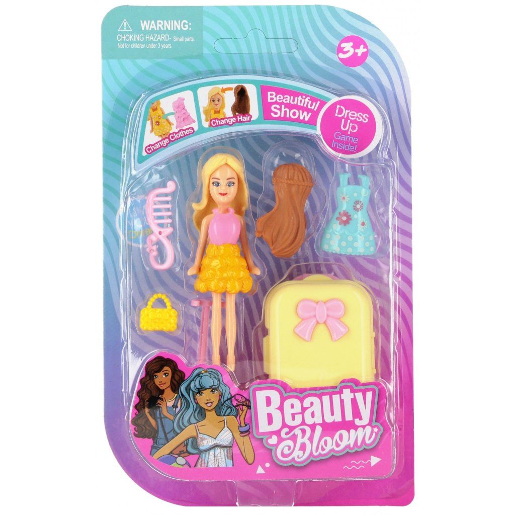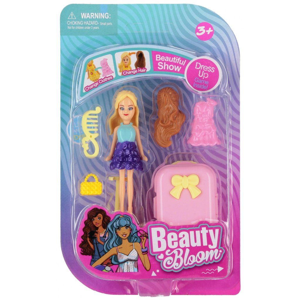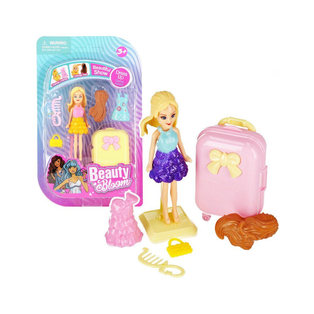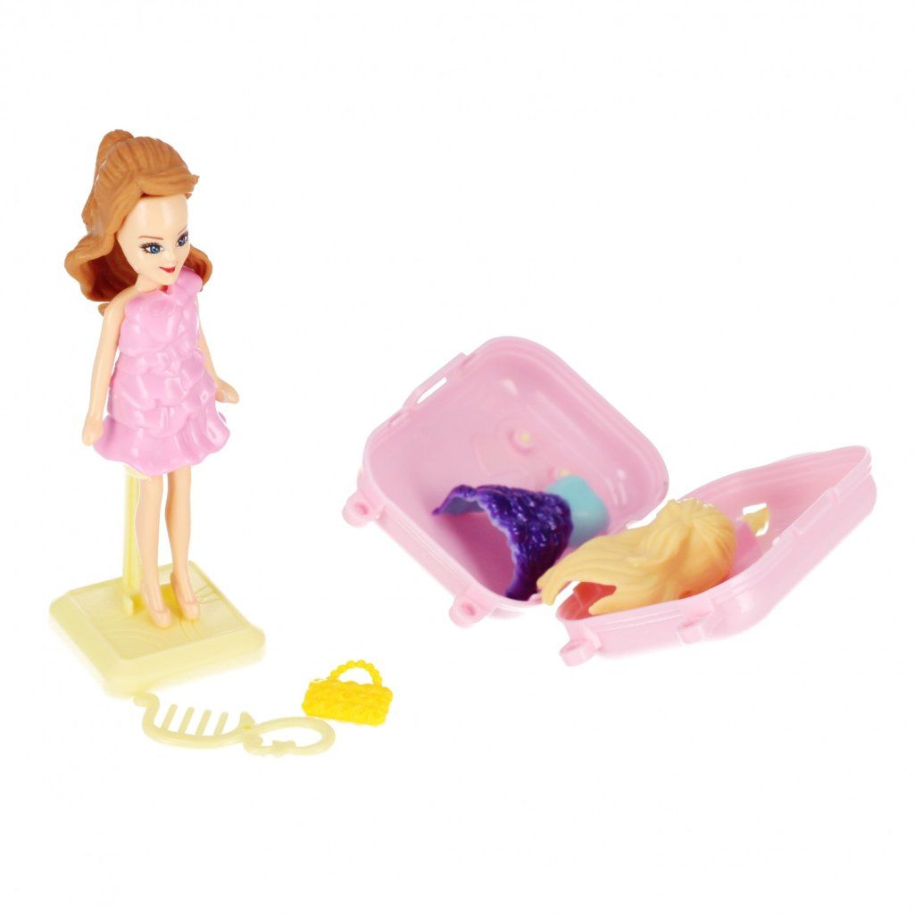 Bábika s príslušenstvom, na výber z rôznych variánt. Obsah setu je kufrík, kabelka, hrebeň do vlasov, šaty. Cena je za 1 set. Má rozmer 9 cm. Vhodné pre deti vo veku 3+....