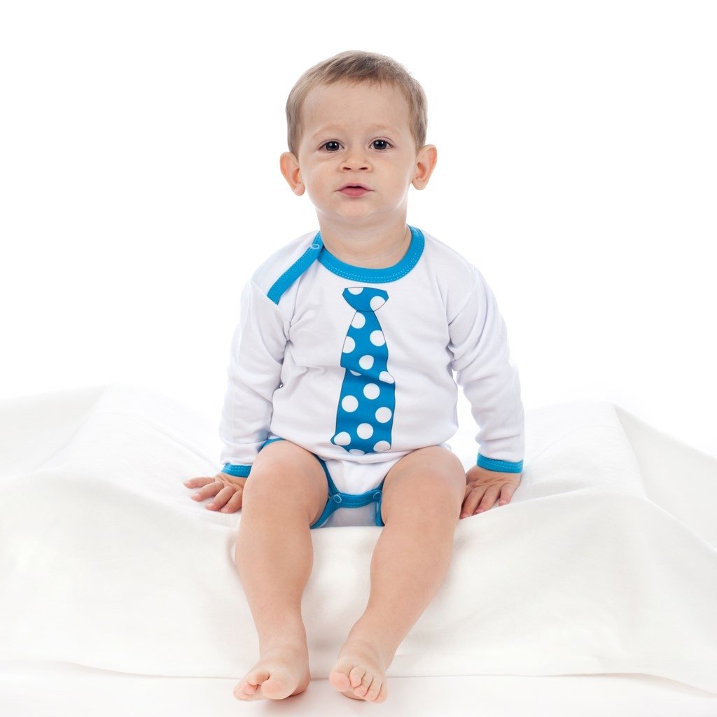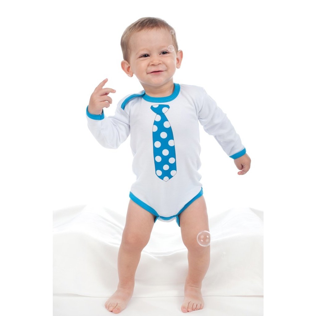 Originálne bavlnené dojčenské body s dlhým rukávom New Baby, s obrázkom tyrkysovej kravaty ozdobenej bodkami. Body má okolo krčku, nožičiek a ručičiek farebné lemovanie. Farby použité ...