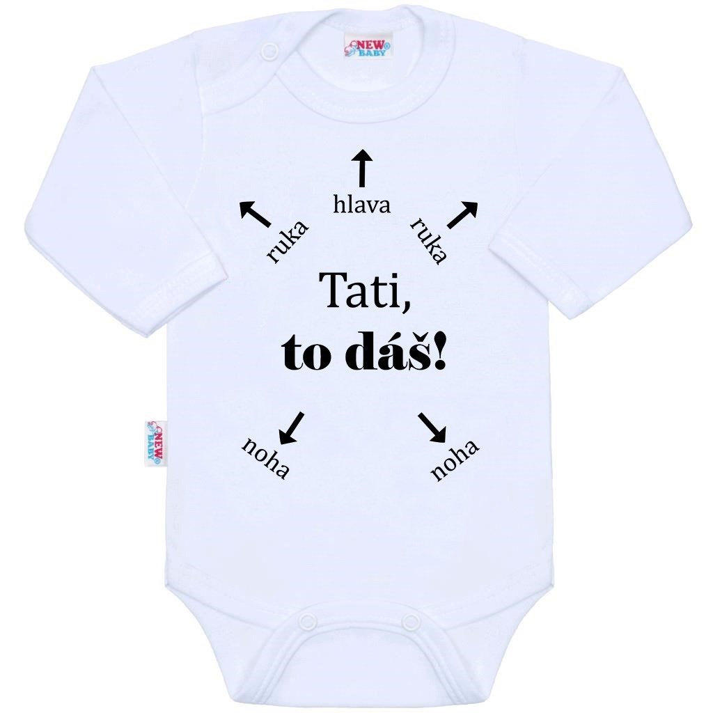 Originálne bavlnené dojčenské body s dlhým rukávom New Baby, s vtipným nápisom Tati, to dáš! Farby použité k potlači sú certifikované a vhodné pre bábätká. Je vyrobené z príjemného a kvalitného materiálu, v ktorom sa bude Vaše bábätko cítiť príjemne. Body má zapínanie na cvočky na ramienku a medzi nožičkami, čo uľahčuje obliekanie a prebaľovanie. Doprajte Vášmu bábätku vyniknúť v originálnom body. Zloženie: 100% bavlna. Rozmery: obvod okolo hrudníka cca 34 cm, dĺžka rukáva cca 16 cm, celková dĺžka cca 30 cm. Veľkosť 50