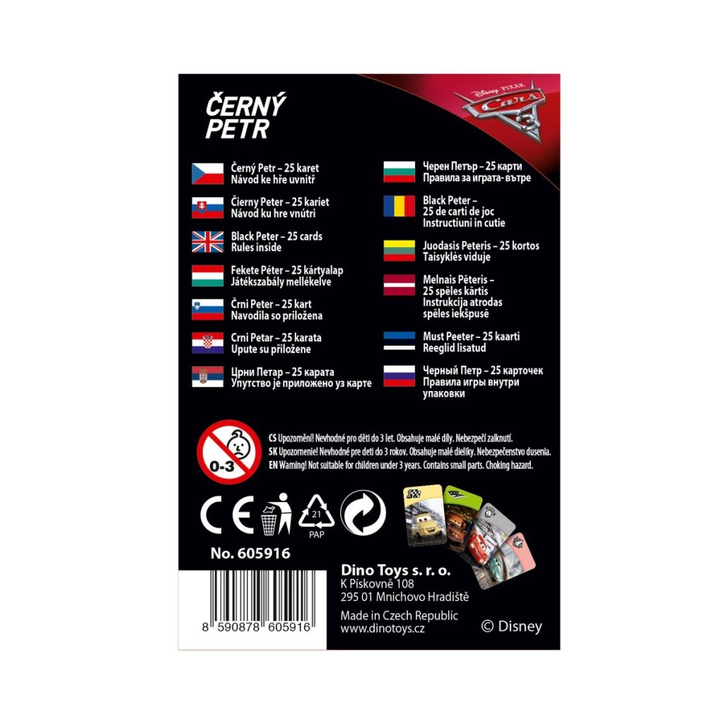 Kartová hra Čierny Peter – Cars 3 prináša obľúbenú klasiku v podobe hrdinov z animovaného filmu. Deti si precvičia pamäť, postreh aj schopnosť sústrediť sa pri hľadaní dvojíc kariet, pričom cieľom je nezostať s kartou Čierneho Petra.