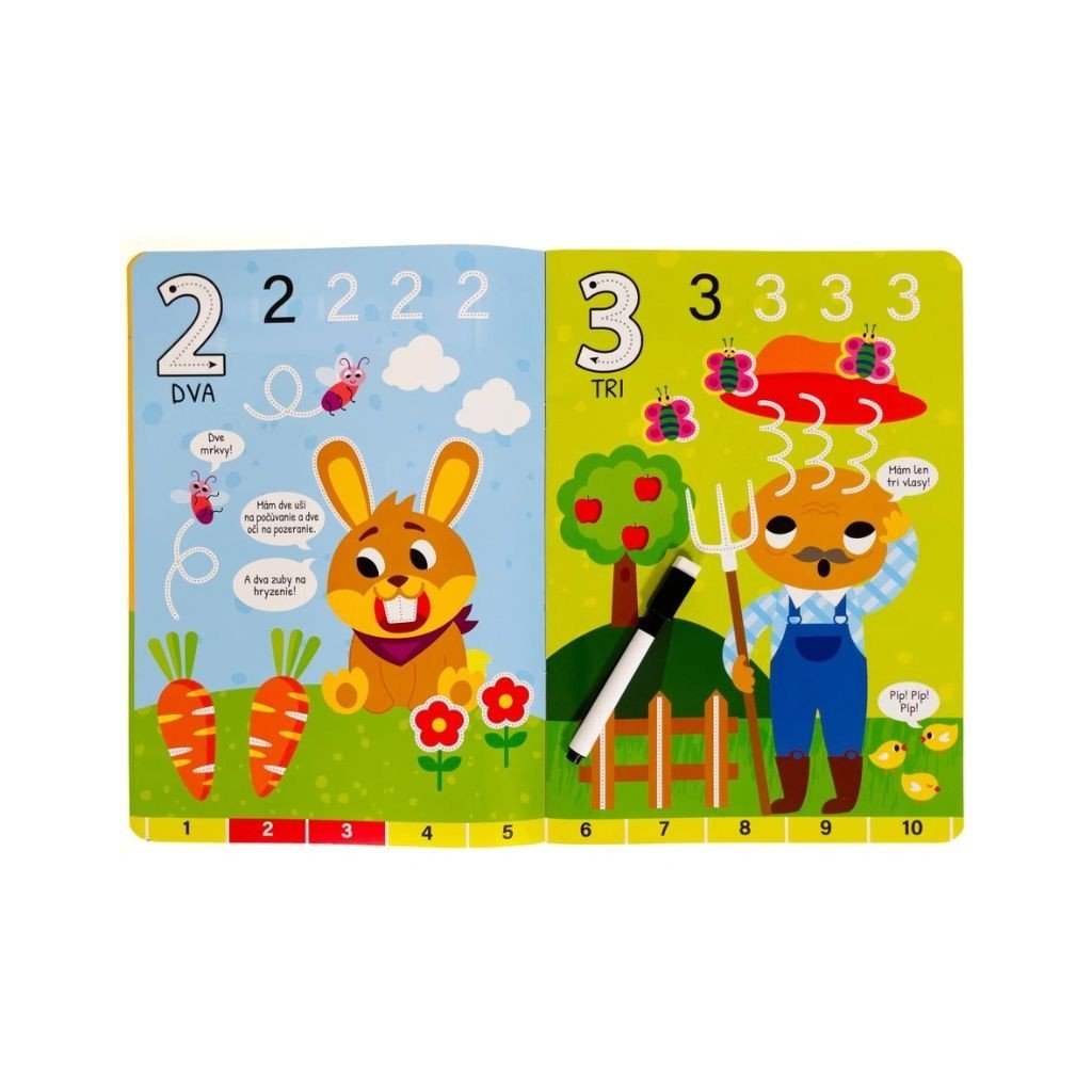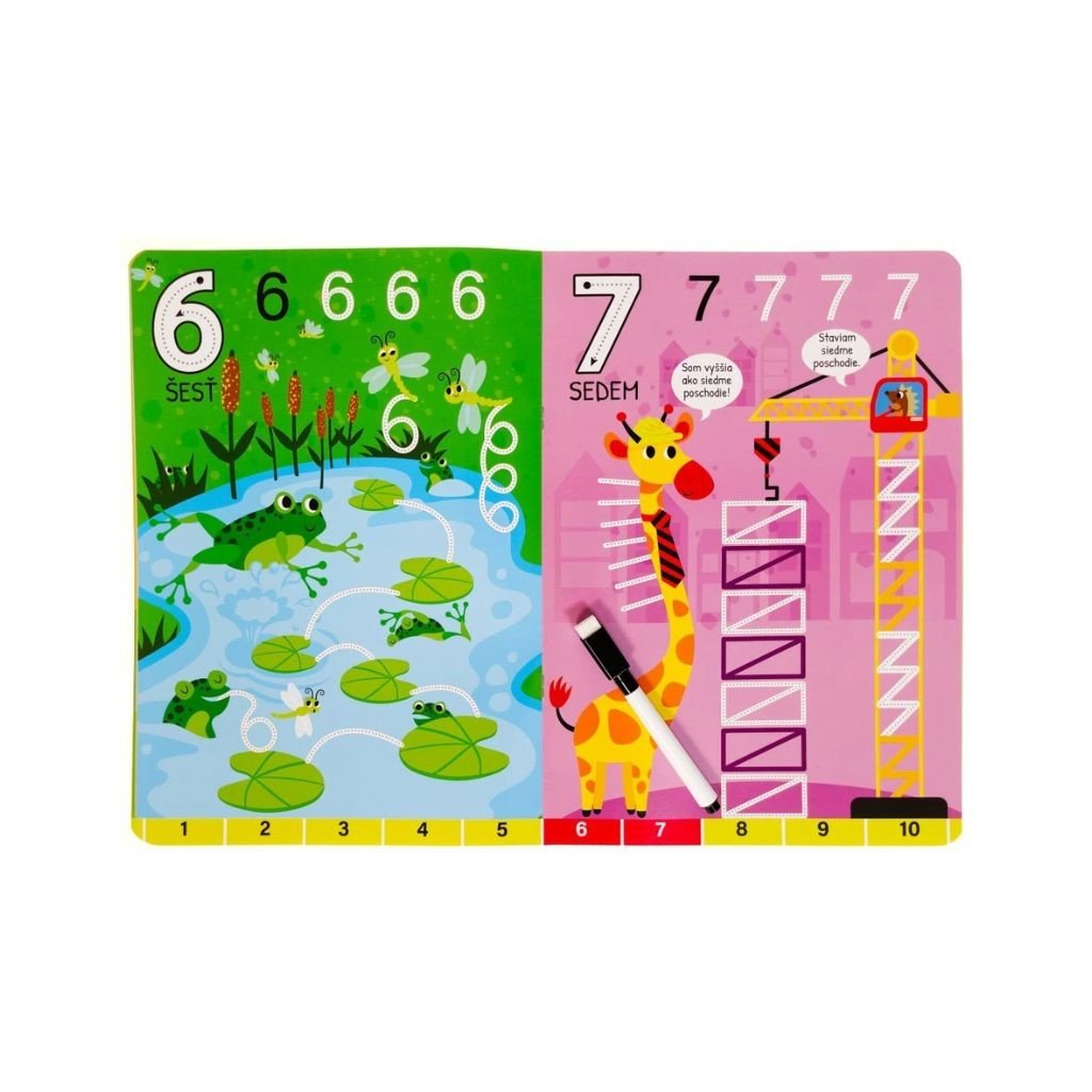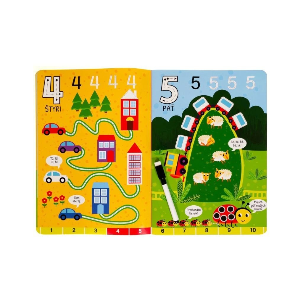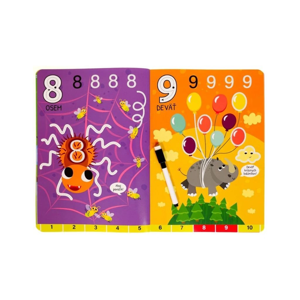 Knižka s pevnými lesklými stránkami a stierateľnou fixkou pripravia pomocou rôznych cvikov vášho predškoláka na písanie čísel a počítanie. Obťahuj čiary, píš čísla, potom všetko ...