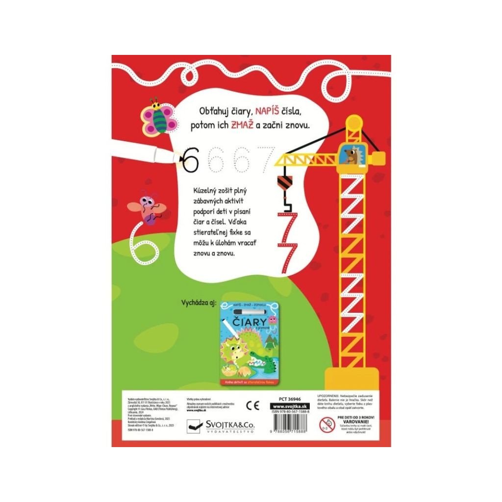 Knižka s pevnými lesklými stránkami a stierateľnou fixkou pripravia pomocou rôznych cvikov vášho predškoláka na písanie čísel a počítanie. Obťahuj čiary, píš čísla, potom všetko zmaž a začni znova. Hravé obrázky nabádajú na obťahovanie rovných, kľukatých aj zakrivených čiar, ktoré v sebe nápadne ukrývajú aj čísla. Zošit s pevnými lesklými stránkami je vhodný pre deti, ktoré sa učia prvé ťahy aj detailnejšie linky, písanie čísel a počítanie. Nemusia sa báť preťahovať a robiť chyby. Keď sa niečo nepodarí, jednoducho to zmažú a vďaka stierateľnej fixke, ktorá je súčasťou zošita, sa môžu k úlohám vracať znova a znova. Rozmer (cm)