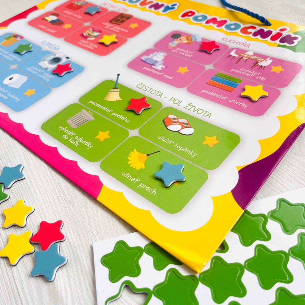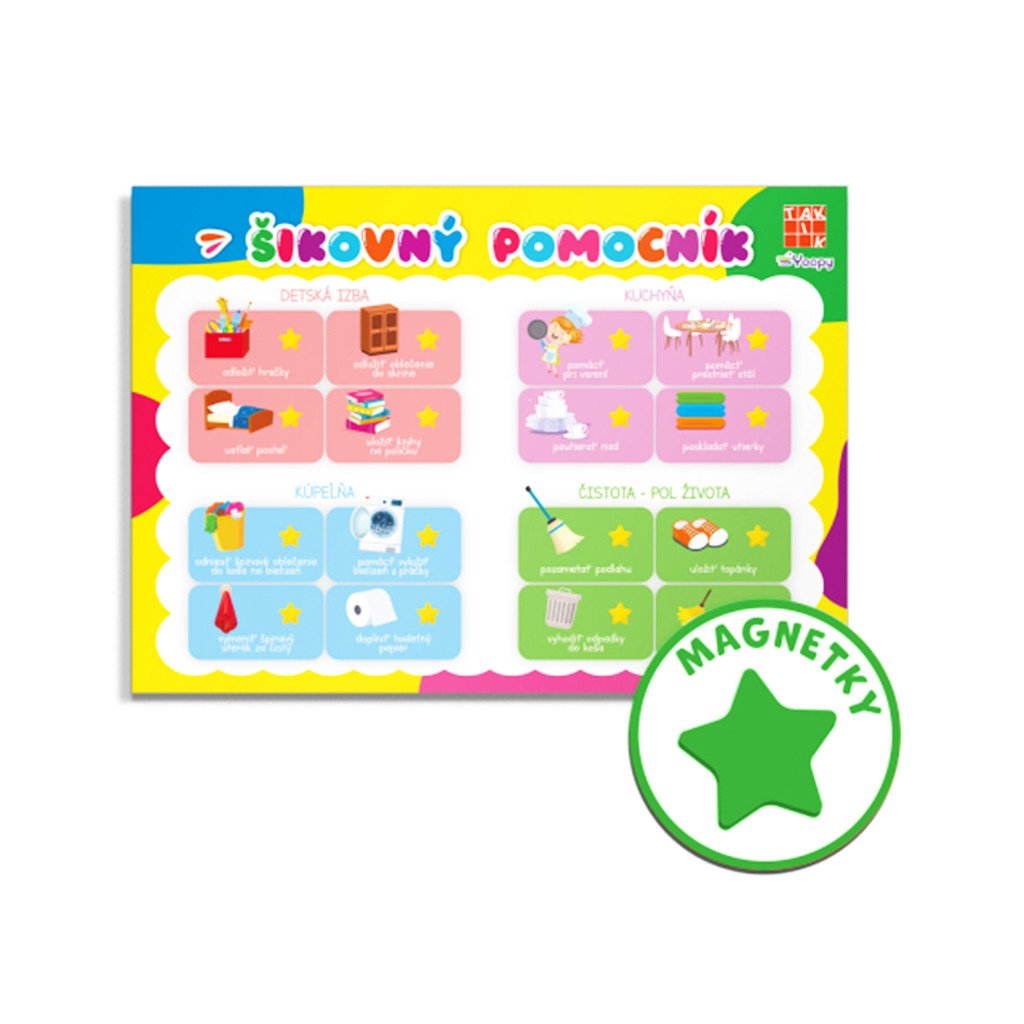 Denný organizér Šikovný pomocník, prispeje k lepšej organizácii detských aktivít zameraných na výpomoc pri rôznych domácich činnostiach. Sadu tvorí pevná magnetická tabuľka vo formáte A3 a 80 magnetiek. Cena je za sadu. Vhodné pre deti vo veku 3+ rokov. Rozmer (cm)
