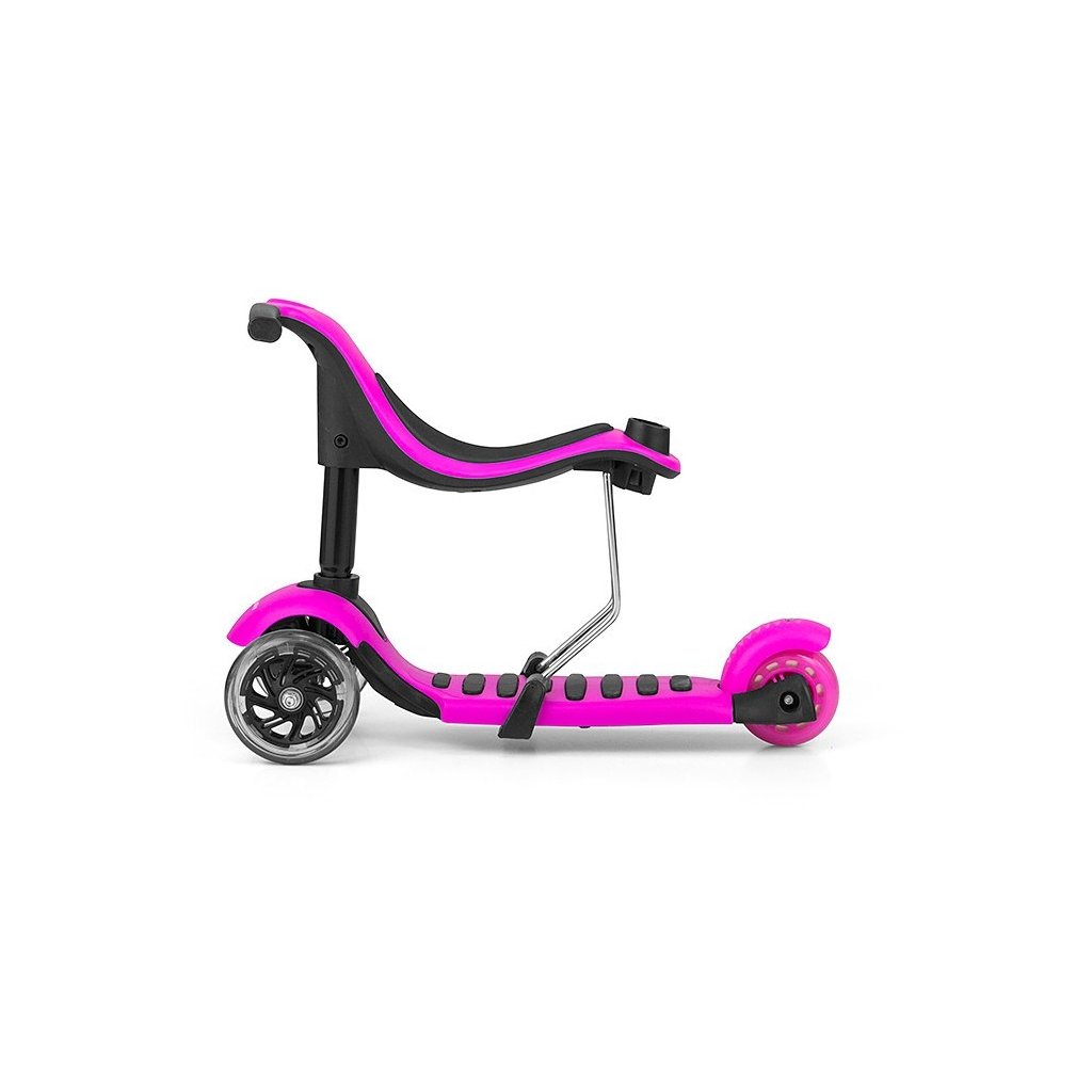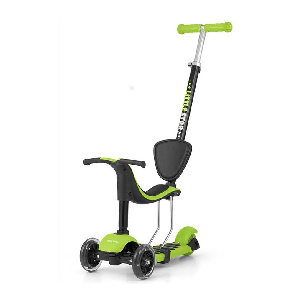 Super štýlová detská kolobežka Milly Mally Little Star. Nie je to len kolobežka, je to tiež odrážadlo pre deti od druhých narodenín, ktoré má sedadlo aj vodiacu tyč pre rodičov. Nosnosť do 20 kg. Sedadlo aj vodiacu tyč možno jednoducho zložiť a z odrážadlá sa razom stane kolobežka s nosnosťou do 50 kg.