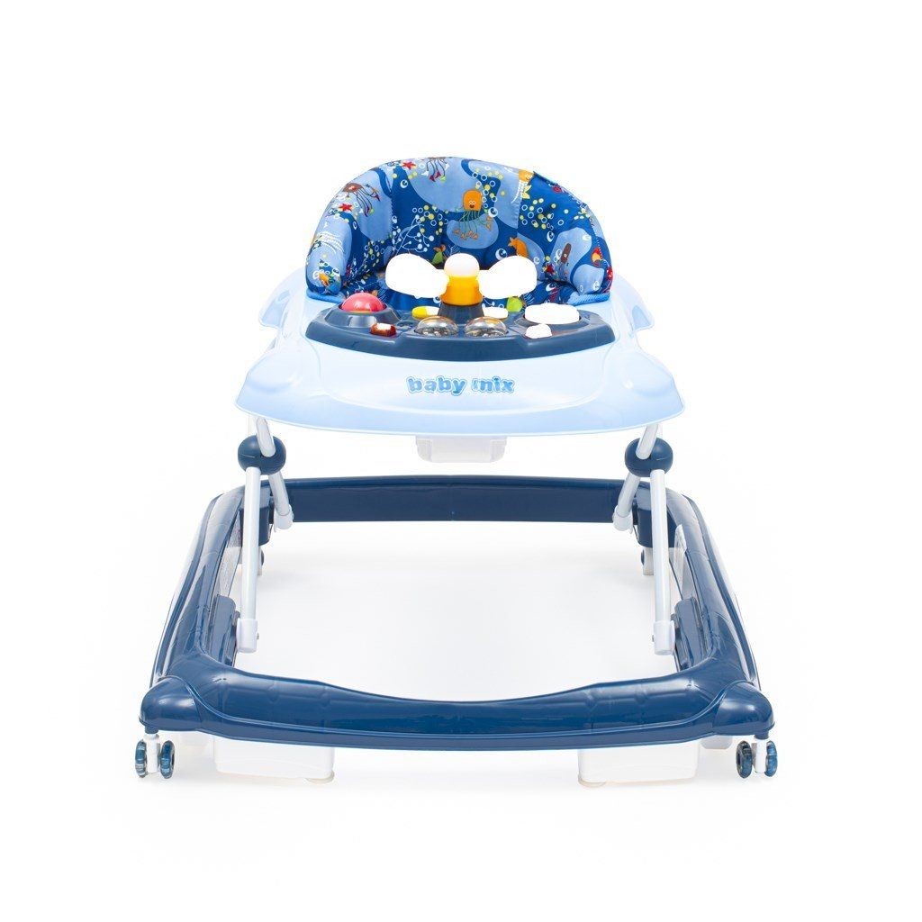 Multimediálne chodítko Baby Mix so silikónovými kolieskami. Chodítko je vybavené pohodlným ergonomicky tvarovaným sedadlom, ktoré zaisťuje správne držanie chrbtice. Multimediálny panel obsahuje rôzne svetelné efekty, trúbiaci volant, ktorým možno otáčať, tlačidlá pre prehrávanie melódií a dve svetlá. Krásne chodítko s hračkami očarí malých objaviteľov a umožní im hrať sa ešte dlhšie. Chodítko je vybavené špeciálnym systémom proti prevráteniu, ktorý zaistí Vášmu dieťaťu pohodlie a bezpečnosť.