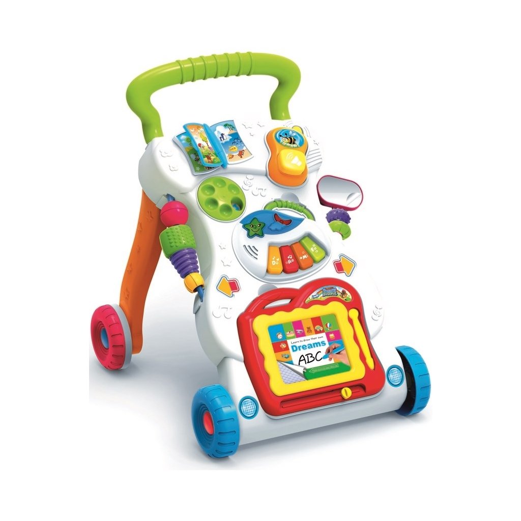 Detské hrajúce edukačné chodítko Bayo vo veselých farbách so štyrmi kolieskami. Chodítko má telefón, ktorý vydá klikacie zvuky a môžeme ho demontovať a podať dieťaťu. Ďalej, krásnu farebnú knižečku, v ktorej dieťa môže otočiť stránku, tabuľu na ktorú môže písať a vymazávať svoje dielka. Tabuľu možno tiež demontovať. Ďalšou časťou chodítka je mini piáno, na ktoré môže dieťa hrať a púšťať si zvuky a rôzne melódie, svetielka v tvare hviezdičky a mesiačika a po bokoch chodítka sú hračky a zrkadielko. Vyrobené z kvalitného plastového materiálu. Rozmer: výška cca 45-48 cm. Batérie nie sú súčasťou balenia ( 2x AA LR6). Určené pre deti od 12 mesiacov. Veľkosť