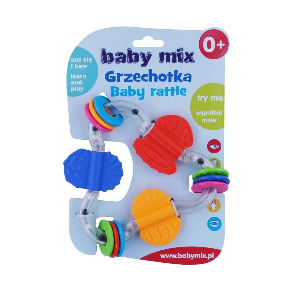Krásna farebná detská hrkálka Baby Mix v tvare osmičky. Hrkálka je určené deťom od narodenia. Atraktívne tvary a intenzívne farby zaujmú pozornosť dieťaťa. Pohyblivé diely zoznamujú dieťa so svetom zvukov a farieb. Hrkálka je vyrobená z bezpečných materiálov.