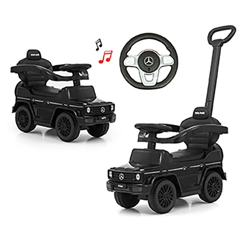 Detské odrážadlo s vodiacou tyčou MERCEDES G350d je vyrobené v licencii koncernu MERCEDES. Váš malý pretekár či pretekárka sa v ňom bude cítiť ako v naozajstnom džípe. Odrážadlo je vyrobené s dôrazom na každý detail a kvalitu použitých materiálov. Jeho vzhľad upúta pozornosť nielen každého dieťaťa, ale aj rodičov. Odrážadlo pomáha rozvíjať motorické schopnosti dieťaťa a Váš malý pretekár či pretekárka si s ním užije veľa zábavy a srandy. Autíčko má na trojramennom volante tlačidla vydávajúce rôzne melódie, zvuk motora alebo húkačku. Je určené ako pre najmenšie deti, ktoré už vedia sedieť, tak aj pre deti, ktoré sa už naučili chodiť. Odrážadlo má otočné predné kolesá, široké a komfortné sedadlo s úložným priestorom a pohodlnú a zároveň pevnú vodiacu tyč, ktorou možno odrážadlo riadiť. Vodiaca tyč, opierky na ruky a podnožky sa dajú zložiť a tým dieťa využije autíčko ako klasické odrážadlo. Batérie nie sú súčasťou balenia (2x AA 1.5V).