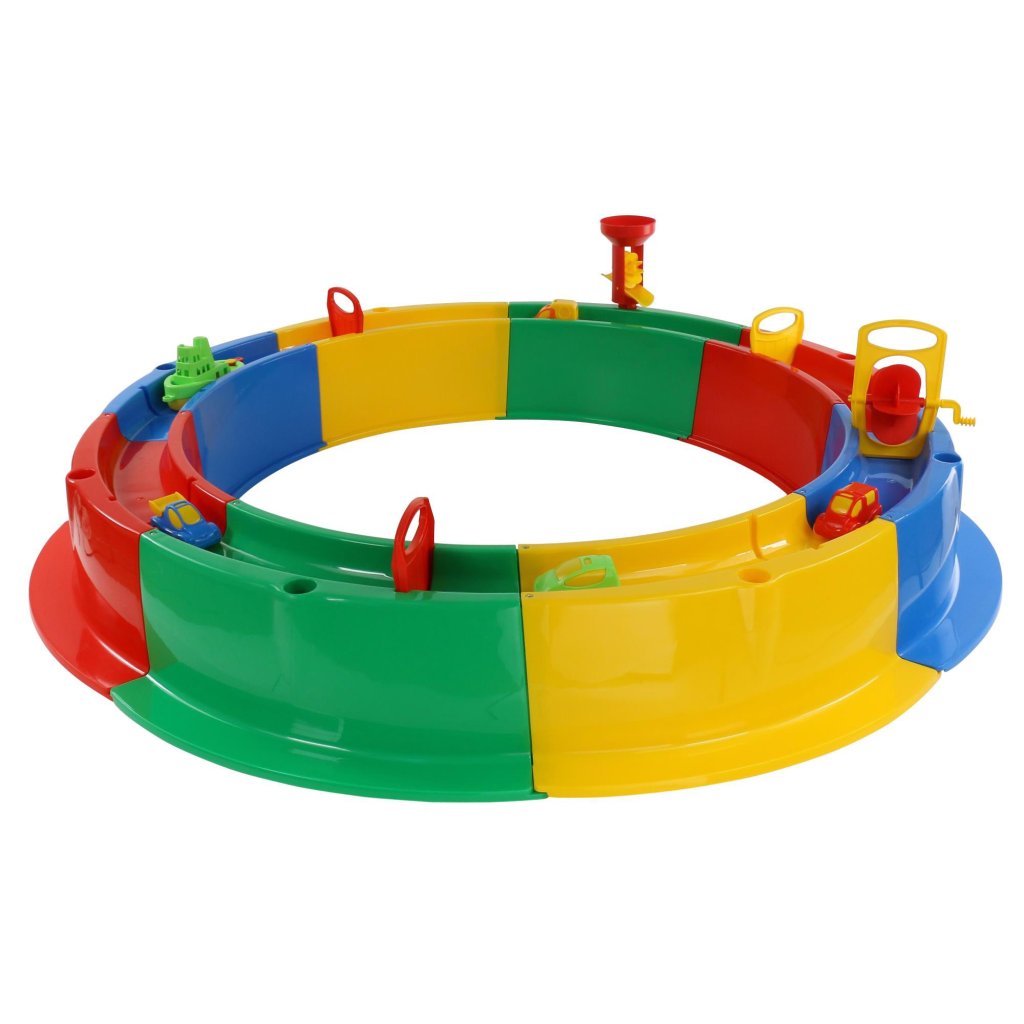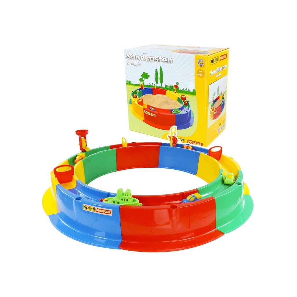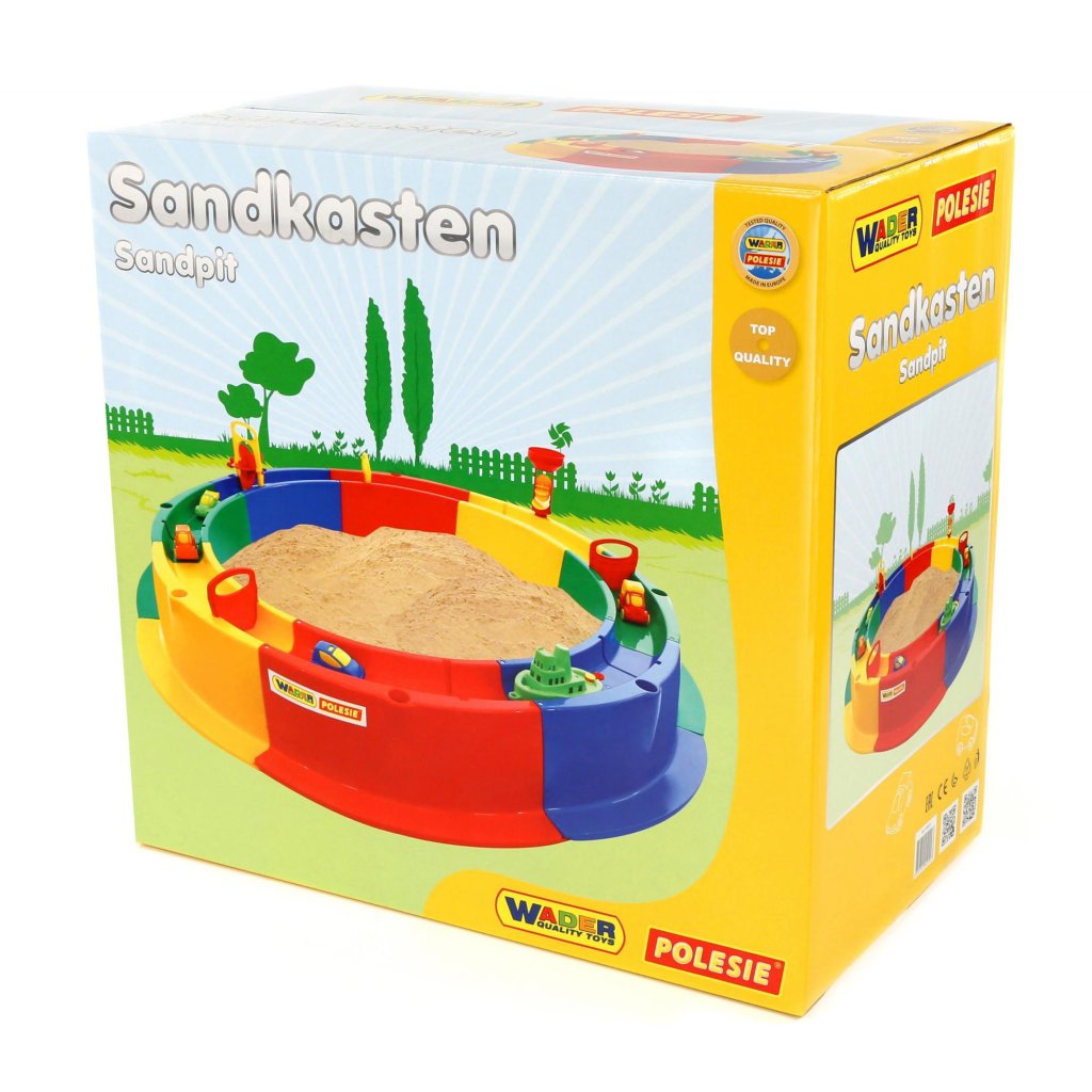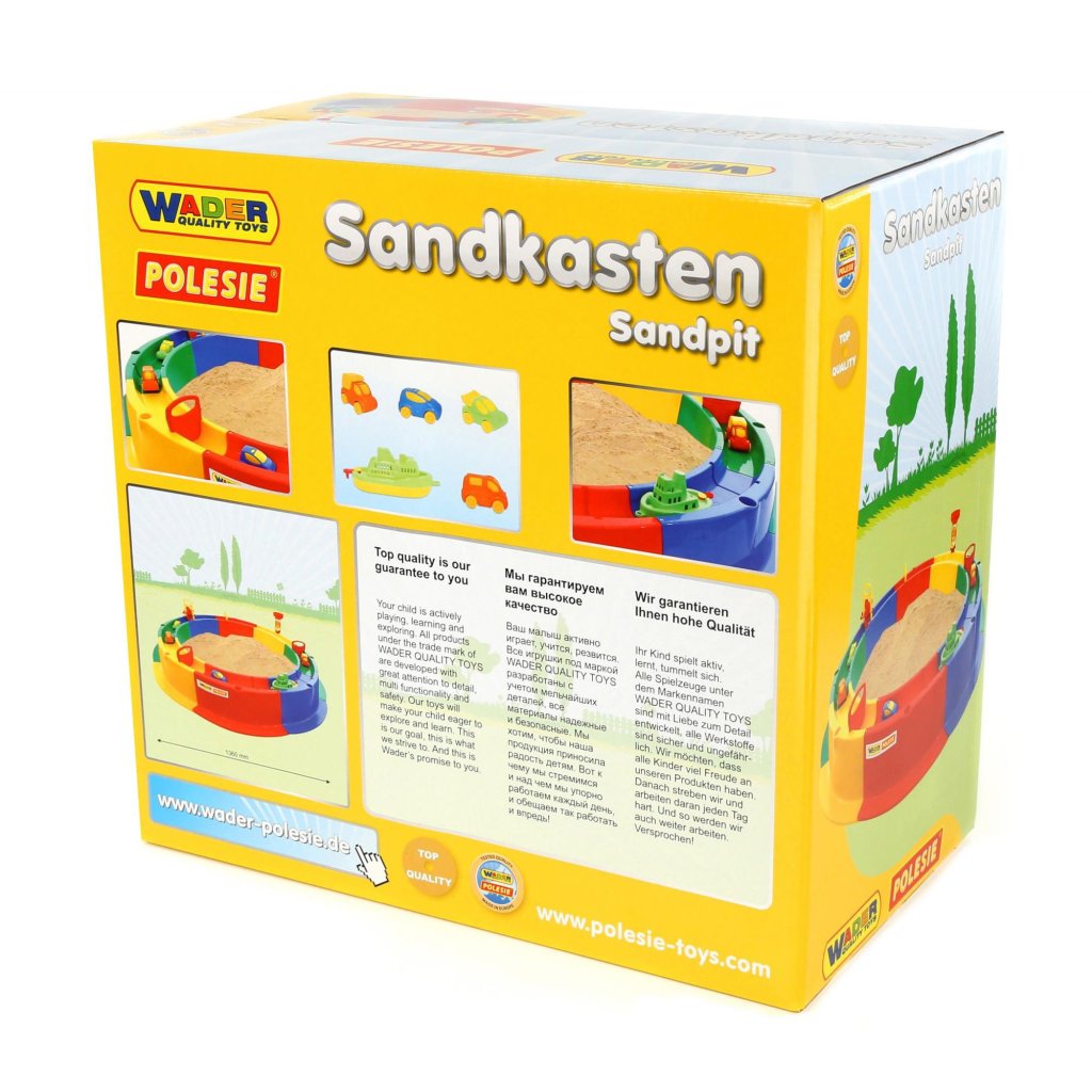 Pieskovisko 1360 s doplnkami, v balení sú vyobrazené časti po zložení s rozmermi 136 x 136 x 18 cm. Vo vrchnej časti obvodu pieskoviska je kanál s loďkou, vodným mlynom, ručným mlynom, 4 autami a zábranami. Vyrobené je vo vynikajúcej kvalite značky Wader qality toys. Rozmer (cm)