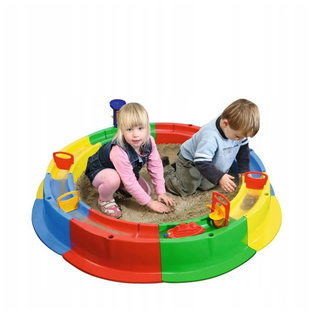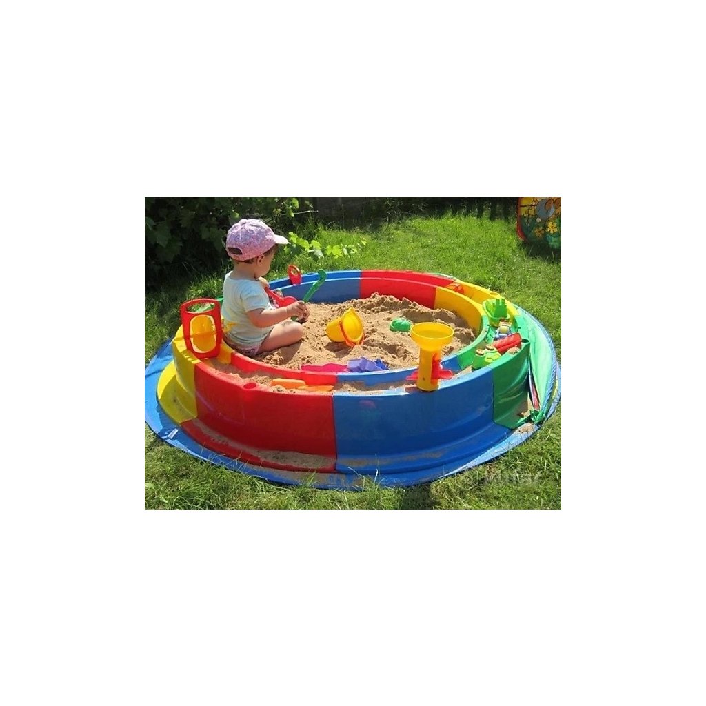 Pieskovisko 1360 s doplnkami, v balení sú vyobrazené časti po zložení s rozmermi 136 x 136 x 18 cm. Vo vrchnej časti obvodu pieskoviska je kanál s loďkou, vodným mlynom, ručným mlynom, 4 ...
