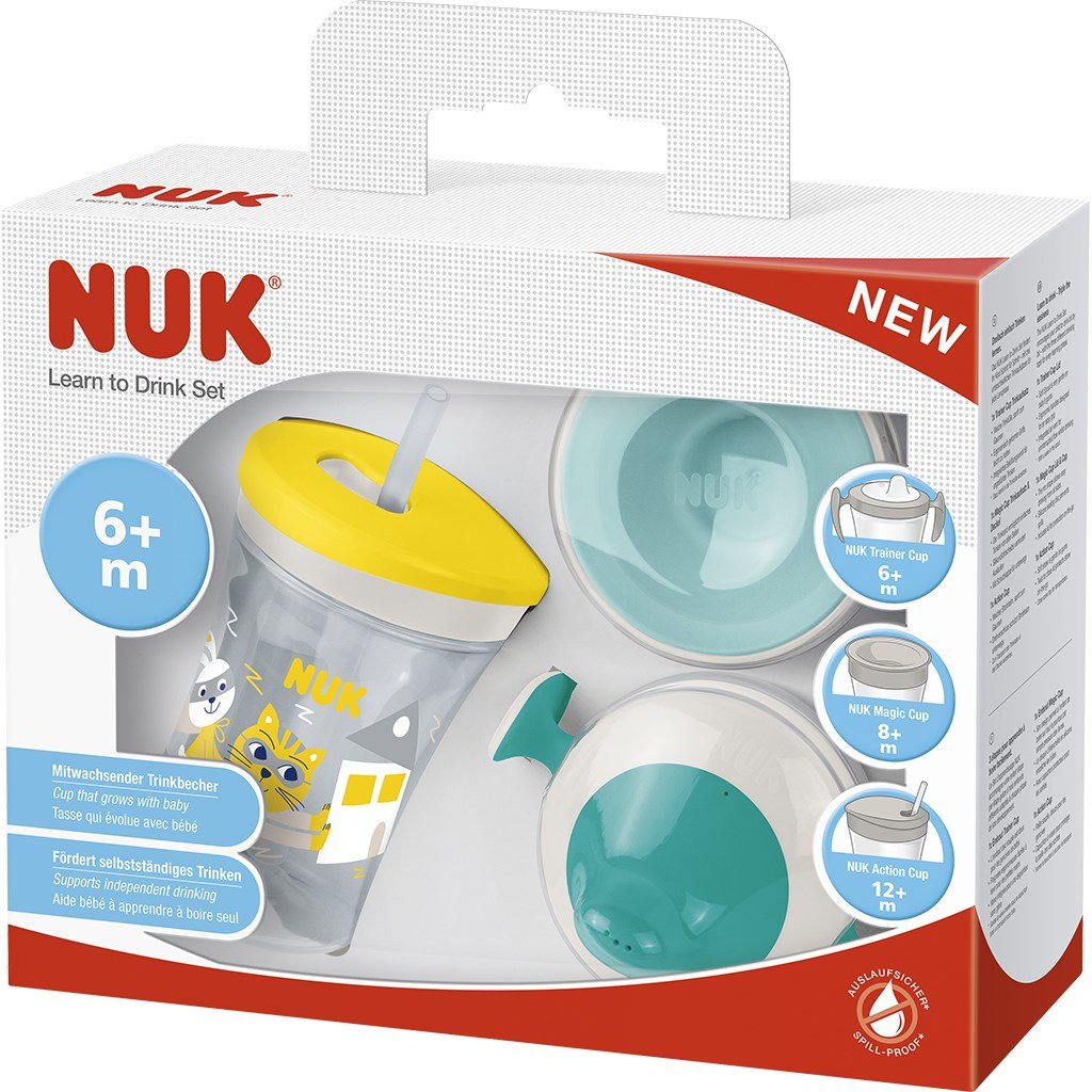 Detský hrnček NUK LEARN TO DRINK SET. 230 ml, darčekové balenie s rôznymi nástavcami na pitie, nekvapkajúce, od 6 mesiacov, neobsahuje BPA.