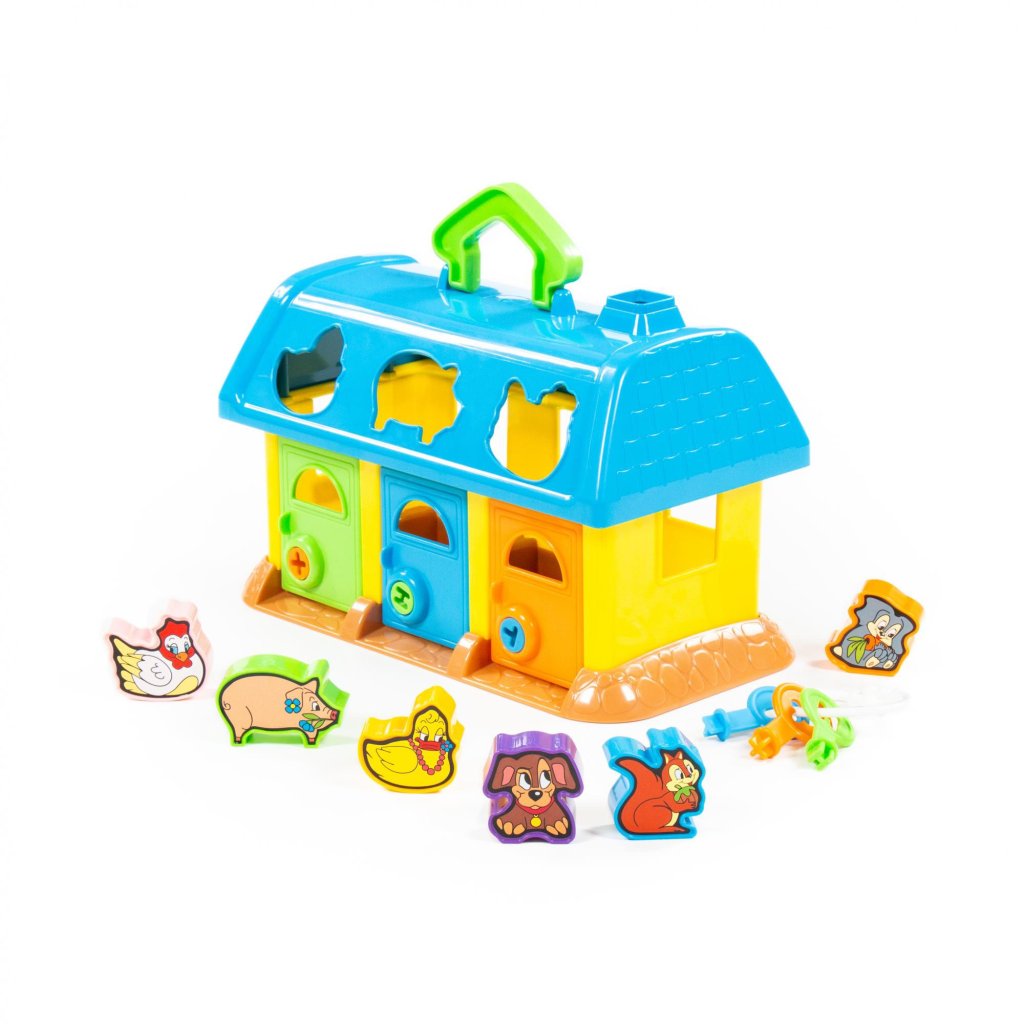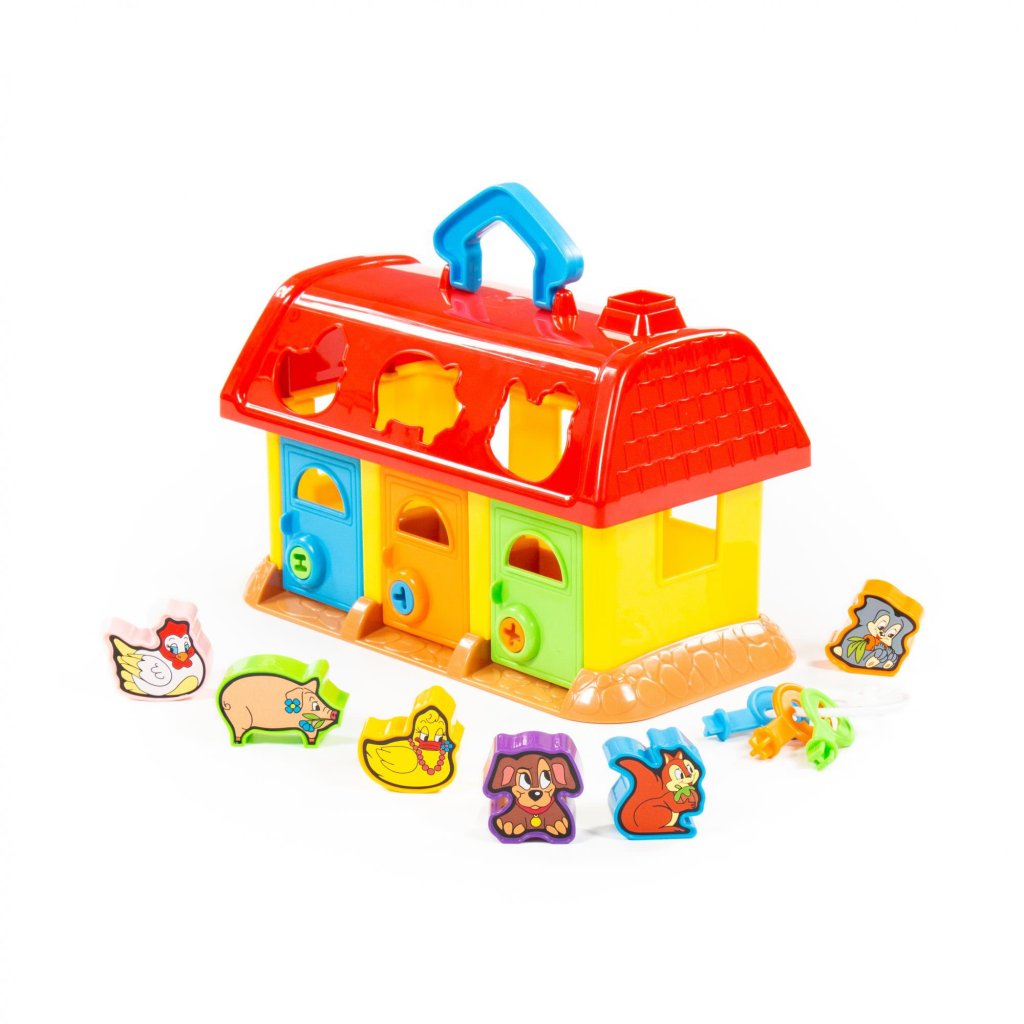 Didaktická hračka - vkladačka, domček z plastu, v balení kľúče na dvierka a 6ks vkladačiek. Podporuje rozoznávanie tvarov, farieb .