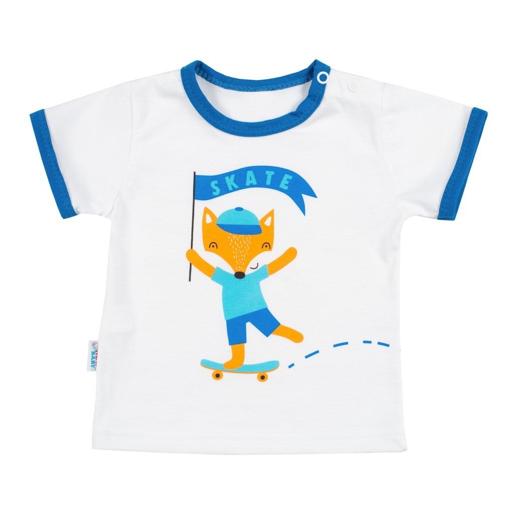 2-dielna bavlnená súpravička New Baby Líška. Súpravička obsahuje tričko a kraťasky. Tričko s krátkym rukávom s farebným lemovaním okolo krčku a rukávov je ozdobené veselým obrázkom líšky a nápisom SKATE. Tričko má zapínanie na ramienku pre ľahké obliekanie. Pohodlné kraťasky sú jednofarebné s gumičkou v páse. Super letný hit a užitočný kúsok do šatníka malého chlapčeka. Zloženie 100% bavlna. Veľkosť 56 (0-3m)