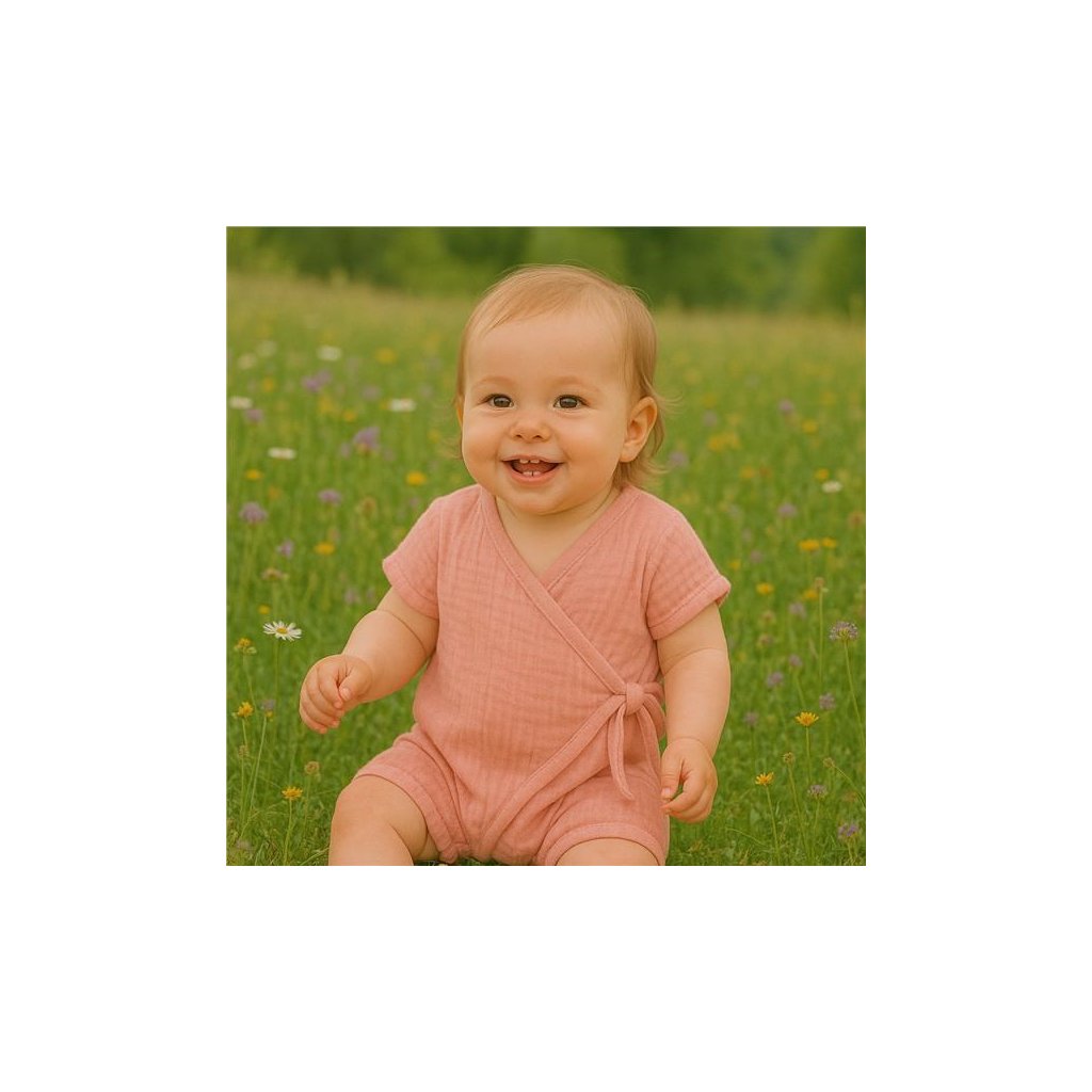 Štýlový letný mušelínový overal s krátkym rukávom New Baby. Zavinovací overálik s krátkym rukávom má praktické zaväzovanie na boku na šnúrky, z vnútornej strany na cvoček a medzi nožičkami na cvočky čo uľahčí obliekanie a prebaľovanie. Na nohavičkách sú jemné gumičky, ktoré ale netlačia na nožičkách. Super štýlový letný overal rozžiari každé bábätko.