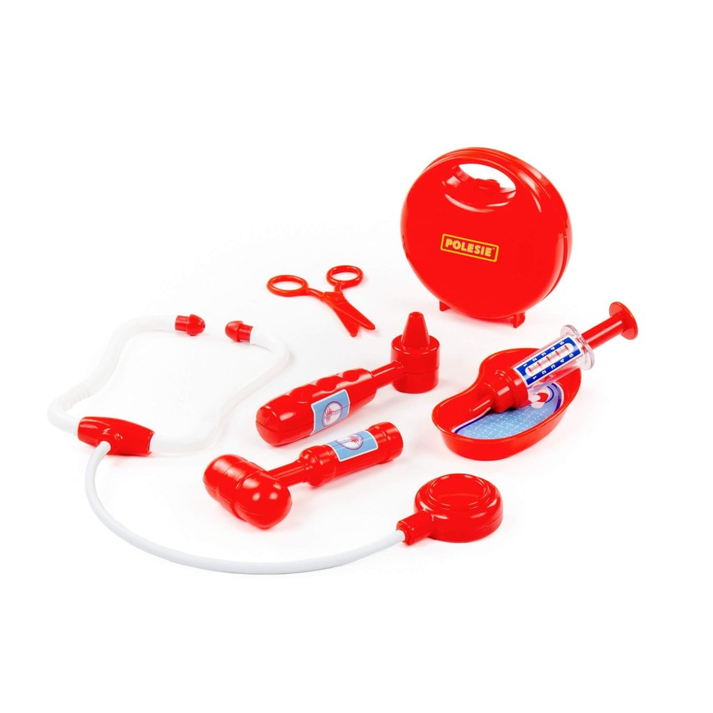 Detská doktorská sada obsahuje základné lekárske nástroje ako nožnice, injekčnú striekačku, stetoskop, otoskop, kladivko, podnos na nástroje a praktický lekársky kufrík. Hračka ...