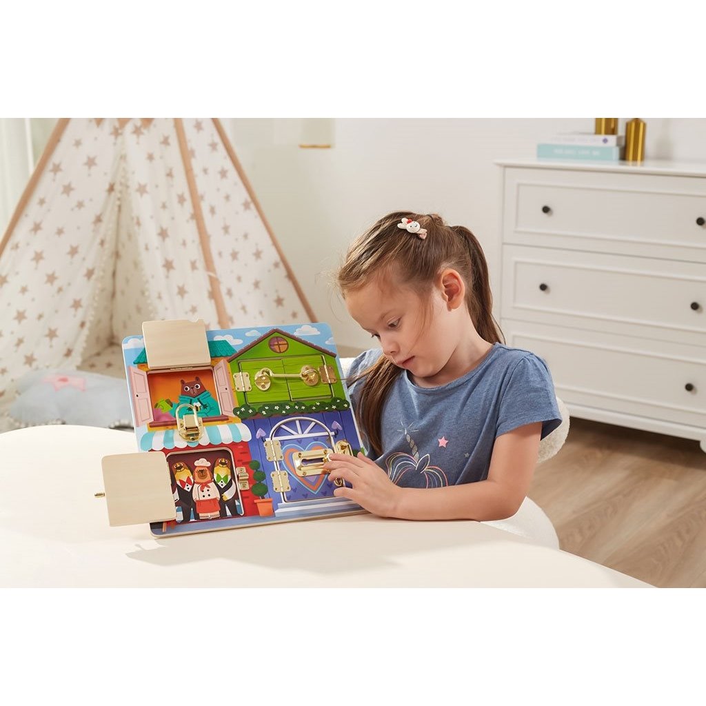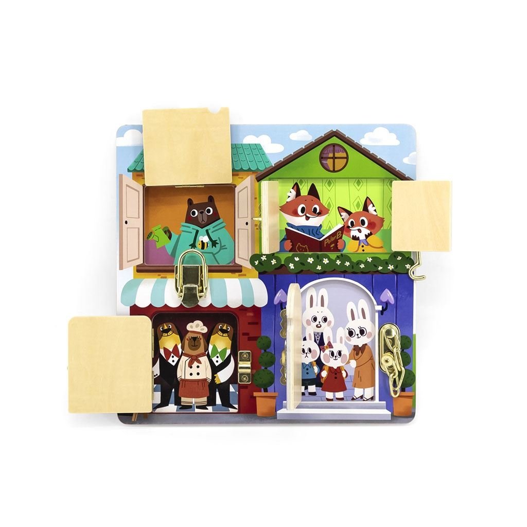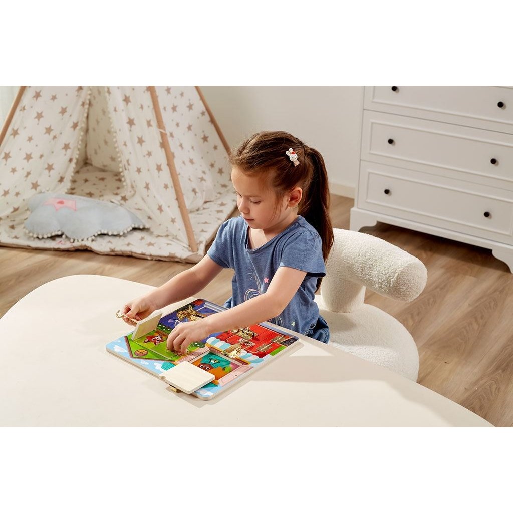 Drevená manipulačná doska v tvare domčeka výborne rozvíja zmyslové a logické myslenie dieťaťa. Hračka navrhnutá spoločnosťou Viga svojím nezvyčajným tvarom rozvíja predstavivosť dieťaťa, ktoré otvára a zatvára zámky na senzorickej doske. Na drevenej doske sú 4 páry dverí a za každými dverami je iný obrázok. Hrajúce sa batoľa musí prísť na to, ako otvoriť rôzne typy zámkov, a keď sa mu to podarí, uvidí za dverami rôzne zvieratká: jedného medvedíka, dve líšky, troch psíkov alebo štyroch zajačikov. Každé dvere sa zatvárajú iným typom zámku.