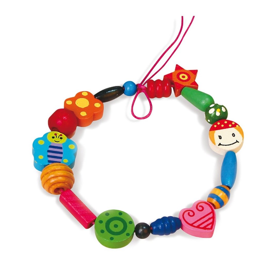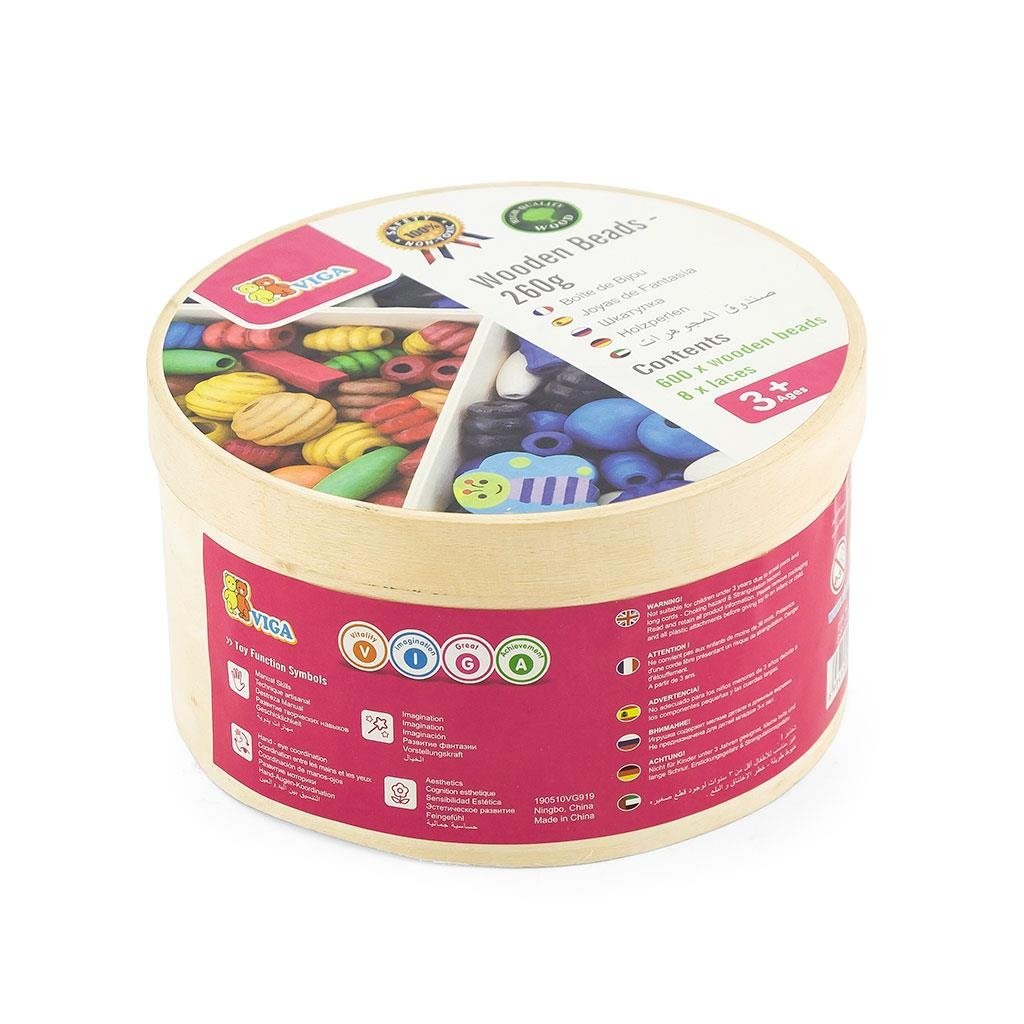 Kreatywny zestaw drewnianych koralików Viga zawiera 600 drewnianych koralików o różnych rozmiarach, kształtach i kolorach. W zestawie znajduje się również 8 sznurków w różnych kolorach. Dzięki zestawowi można stworzyć bransoletki lub naszyjniki.
