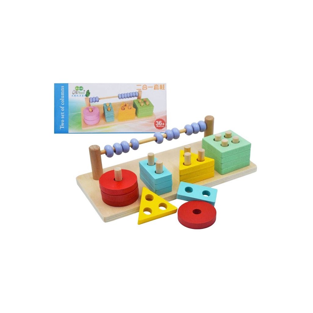 Drevená doska so stĺpikmi. Každý z nich má štyri farebné geometrické tvary (trojuholník, štvorec, kruh a obdĺžnik). Za stĺpikmi je počítadlo. Vhodné na precvičenie logika a jemnej motoriky. Nevhodné pre deti do 3 rokov. Rozmer hračky je 23,5 x 10,5 x 6cm. Rozmer (cm)
