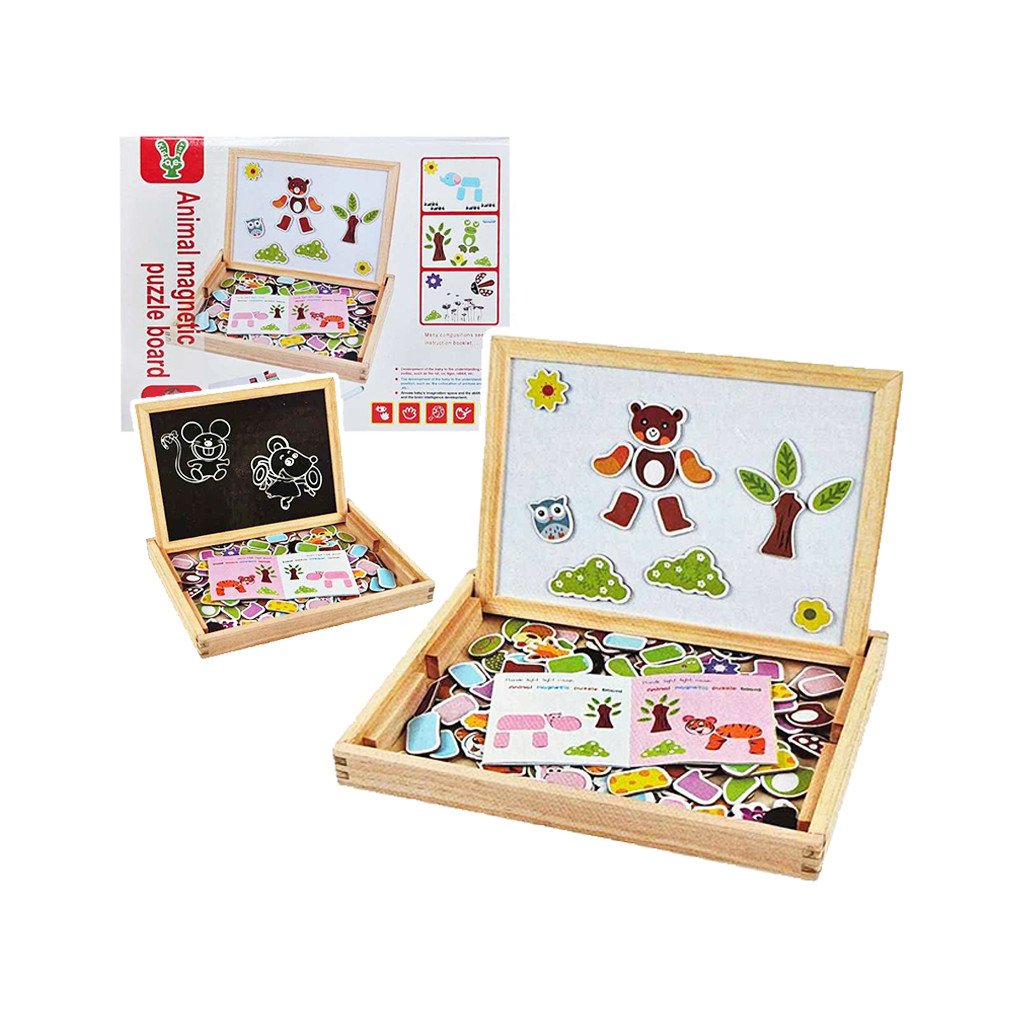 Drevená náučná tabuľa, hravá pomôcka, s ktorou sa deti môžu učiť kresliť, písať a skladať obrázky. Obsah sady je drevený box, obojstranná tabuľa na písanie kriedami a fixami, kriedy, fixa, hubka na čistenie tabule, magnetické puzzle a knižočka s návodmi na tvorenie obrázkov. Má rozmery 30,5×23,5×3,5 cm. Cena je za kus. Vhodné pre deti vo veku 3+ rokov. Rozmer (cm)
