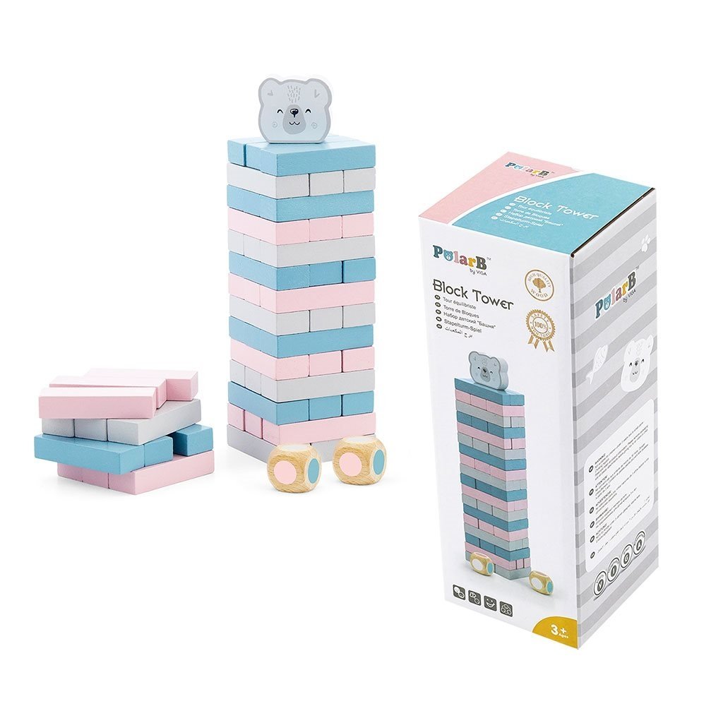 Obľúbená hra na skladanie veže v nových tlmených farbách od spoločnosti VIGA zo série Polar Bear. Hra, do ktorej sa určite zapojí celá rodina. Hra sa začína postavením východiskovej veže z drevených blokov uprostred stola alebo podlahy. Akonáhle máme štartovaciu vežu - každý hráč si postupne vezme jeden vybraný alebo nakreslený blok niekde v strede veže a umiestni ho na vrchol veže, čím stavia vežu smerom nahor. Cieľom hry je postaviť čo najvyššiu vežu. Hra rozvíja koordináciu rúk, precvičuje koncentráciu a je zdrojom nekonečnej zábavy pre celú rodinu!