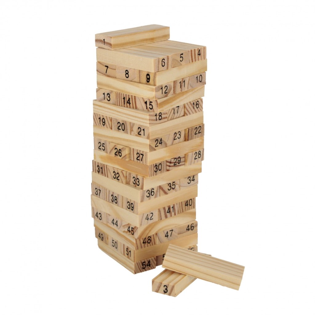 Drevená veža, postavte vežu z drevených kociek. Hra obsahuje 54 drevených kociek a 4 kocky. Má rozmery 7x22x7 cm. Vhodné pre deti vo veku 3+ rokov. Rozmer (cm)
