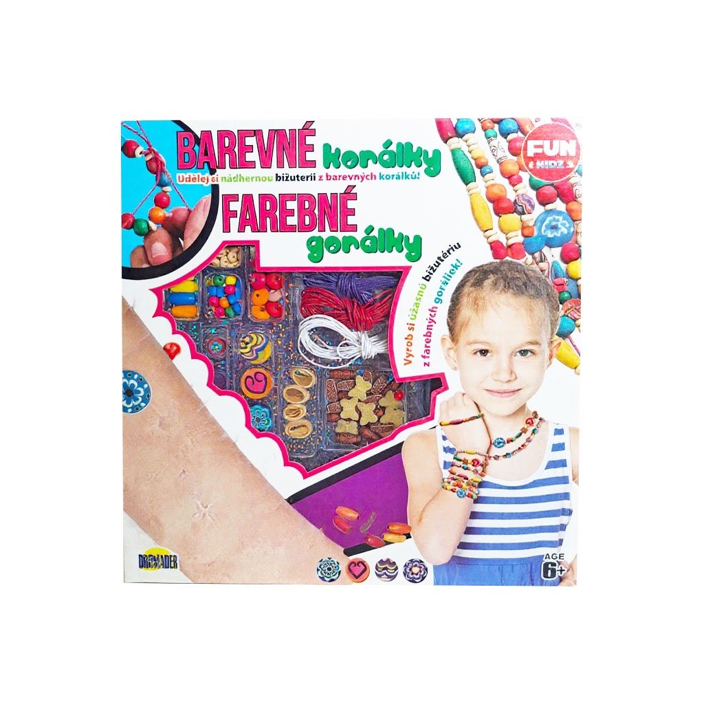 Sada na výrobu krásnych drevených šperkov. Obsahuje: farebné šnúrky, farebné drevené a plastové korálky a návod. Rozmery balenia: 26 x 26 x 4 cm. Vek: 6+...
