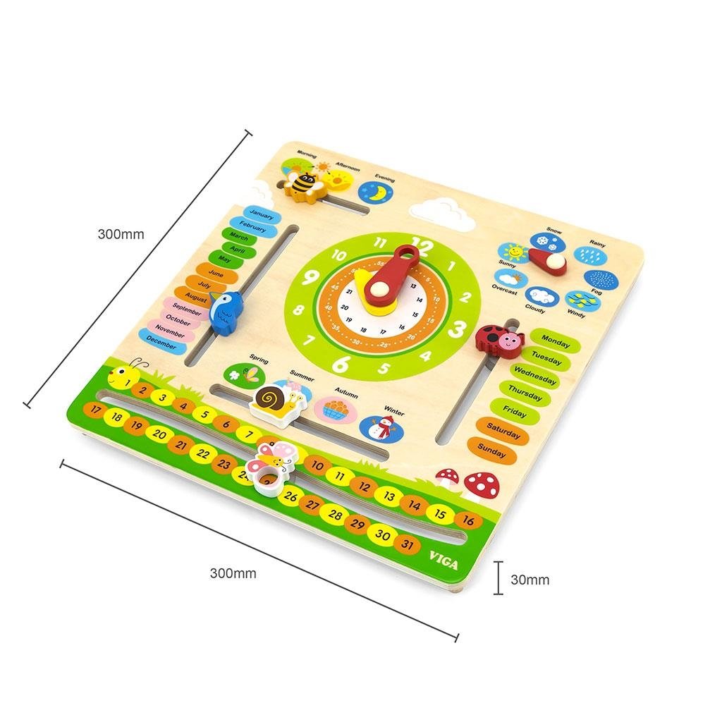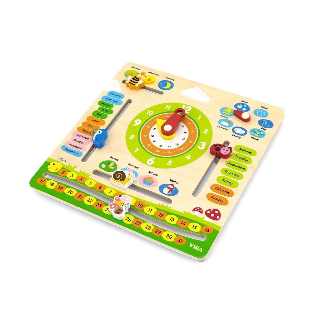 Objavovanie sveta s dreveným kalendárom s hodinami v angličtine od Viga Toys je ideálna vzdelávacia a darčeková sada, vhodná na hodiny angličtiny ako názorný materiál. Učenie hodín na analógových hodinách bude s tabuľkou Viga jednoduchšie a hra s kalendárom podporí učenie sa čítať a písať dátum. Dieťa sa naučí názvy mesiacov, dní v týždni, ročných období a dní a pojmy súvisiace s počasím v angličtine. S učebnou tabuľou budú môcť rýchli žiaci objavovať a učiť sa a zároveň sa zabávať. Súprava na učenie času je vhodná aj na rozvoj Montessori. Ideálna hračka na zavesenie doma, v škôlke alebo v škole.