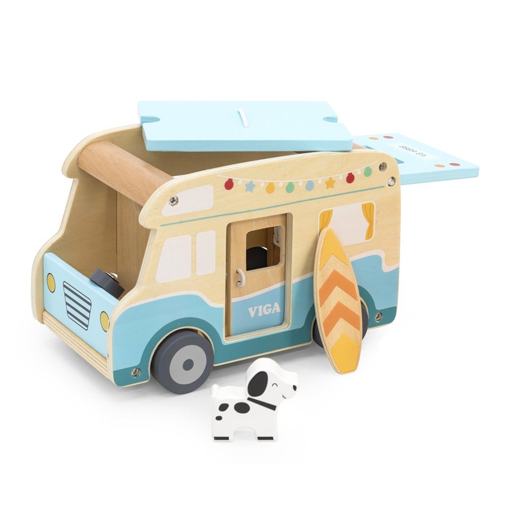 Drevený karavan je výnimočná hračka, ktorá prenesie deti do sveta prázdninových dobrodružstiev a letných ciest! Sada je inšpirovaná bezstarostnými výjazdmi k moru, a vďaka precíznym detailom a realistickým funkciám — ako posuvné dvere, výsuvná strecha či strešný nosič na surfovaciu dosku — poskytuje deťom hodiny pútavej a tvorivej hry. Karavan obsahuje bohaté príslušenstvo vrátane dvoch bábik, psíka, lehátok s vankúšikmi, plážového slnečníka, grilu, dokonca aj surfovacej dosky, čo umožňuje napodobňovať rôzne scénky hry. Deti si môžu vymýšľať situácie s cestovaním, odpočinkom na pláži či organizovaním pikniku.