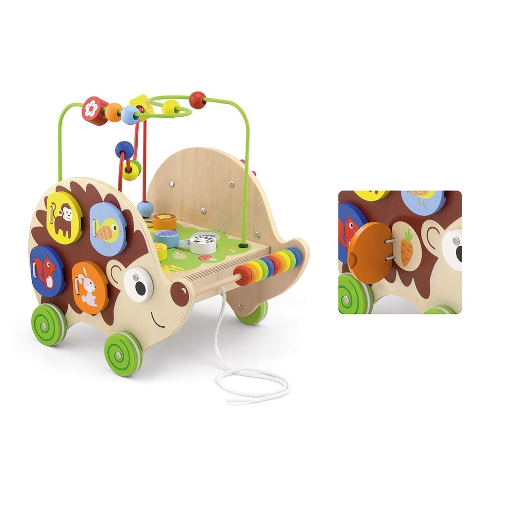 Priestorové bludisko v podobe rozkošného ježka je multifunkčná hračka na ťahanie. Ježko poskytne vášmu dieťaťu hodiny zábavy plnej atrakcií. Prvou sú korálky priamo pri Ježkovom nose, ktoré možno použiť ako počítadlo. Ďalšou atrakciou sú farebné korálky rôznych tvarov a farieb, ktoré sa dajú voľne pohybovať po kovových tyčiach. V spodnej časti priestorového bludiska sa nachádza druhé dráhové bludisko, kde má batoľa za úlohu správne priradiť hlavy zvieratiek k obrázku, ktorý treba nájsť. Na zadnej strane Ježka sa nachádzajú ďalšie atrakcie: na jednej strane sú ozubené kolieska, ktoré prinesú veľa zábavy každému dieťaťu; zatiaľ čo na druhej strane sú Ježkovi kamaráti. Pod ich obrázkami sa nachádzajú pochúťky príslušného zvieratka. Ježko sa rád vydá na cestu s vaším dieťaťom - má šnúrku a kolieska s protišmykovým uzáverom.