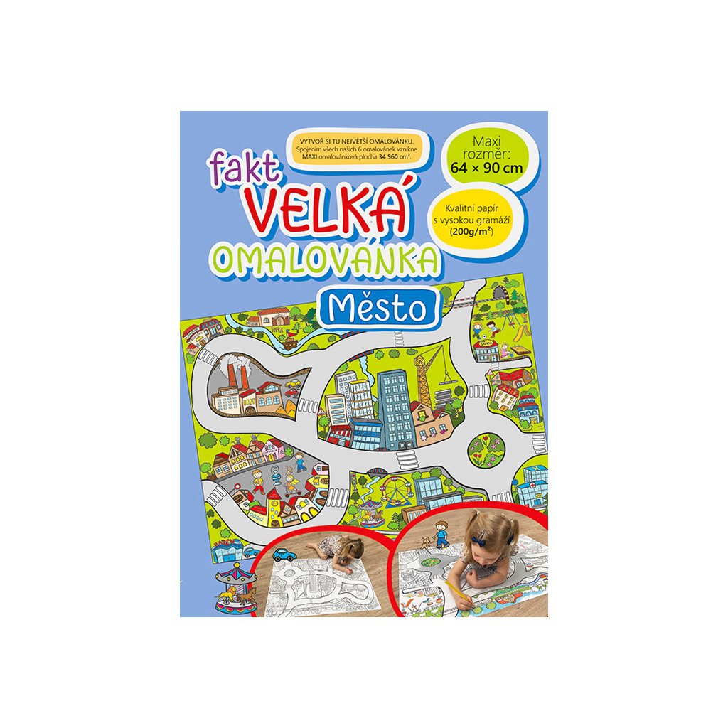 Fakt velká omalovánka Mesto, omaľovánka má rozmer 64 x 90 cm. Papier má vysokú gramáž 200 g, preto môžete zvoliť na omaľovanie pastelky, voskovky alebo aj vodové farby. Pri zakúpení všetkých 6 typov omaľovánky, ich možno spojiť do jedného veľkého diela prepojeného cestou. Rozmer (cm)