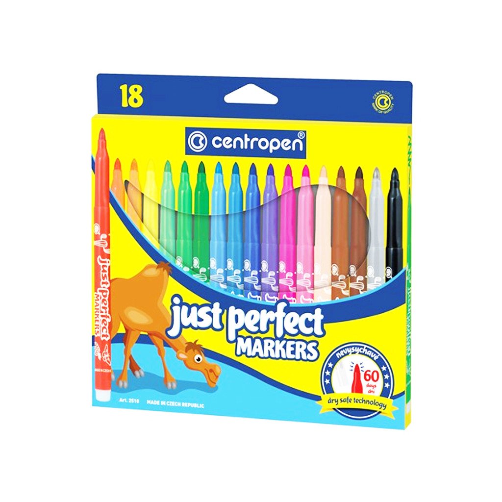 Fixy Just Perfect Centropen veľká sada, s nevysychajúcim a vyprateľným atramentom. Hroty majú priemer 2-3 mm. Sada obsahuje 18 farieb fixy. Cena je za 1 sadu. Rozmer (cm)