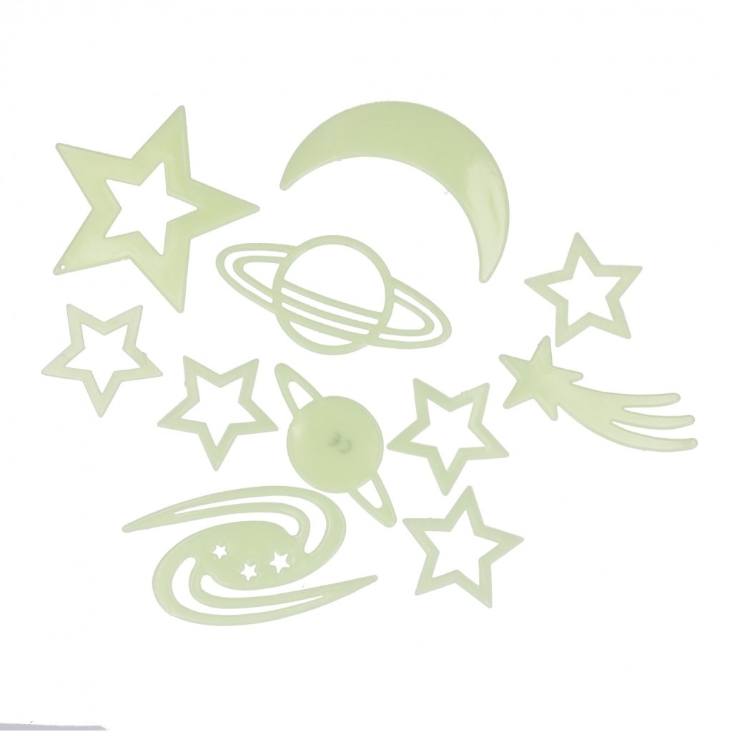 Fluorescenčné vesmírne dekorácie krásne žiaria v tme a premenia každú detskú izbu na malý vesmír. Ideálne na stenu alebo strop, reagujú aj na UV svetlo. Mix vzorov – planéty, hviezdy a ďalšie tvary. Jednoduché nalepenie. Určené pre deti od 3 rokov. Cena za kus. Rozmer (cm)