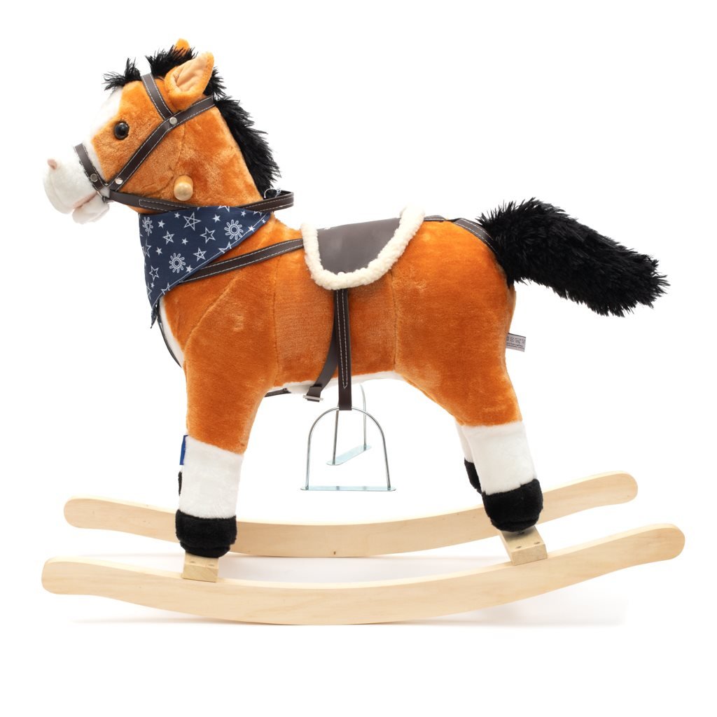 Mäkučký hojdací koník Baby Mix bol navrhnutý pre deti, ktoré majú rady dobrodružstvo. Vyzerá ako skutočný, takže sa vaše dieťa bude cítiť ako skutočný jazdec. Koník je vyrobený z mäkkého plyšu, okolo krku má ozdobnú šatku a je vybavený drevenými hojdacími lištami, ktorých profil chráni dieťa pred prevrátením. Pohodlné sedlo, pevná uzda, kovové strmene, drevené rukoväte a stabilné hojdacie lišty zaistia vašim kovbojom ešte väčšiu stabilitu a pohodlie počas hojdania. Je vyrobený z mäkkého plyšového materiálu, pevné drevené lišty alebo rukoväte je možné ľahko odskrutkovať. Po stlačení tlačidiel na uškách koník vrtí chvostíkom, hýbe tlamičkou, ozvú sa zvuky cvalu, koník zaerdží a zaspieva kovbojskú pesničku. Tri potrebné batérie AA 1,5 V sa vkladajú do púzdra umiestneného na brušku koníka a nie sú súčasťou balenia. Počas hojdania sa dieťa učí koordinovať pohyby svojho tela s koníkom, čo zlepšuje celkovú rovnováhu a motoriku dieťaťa.