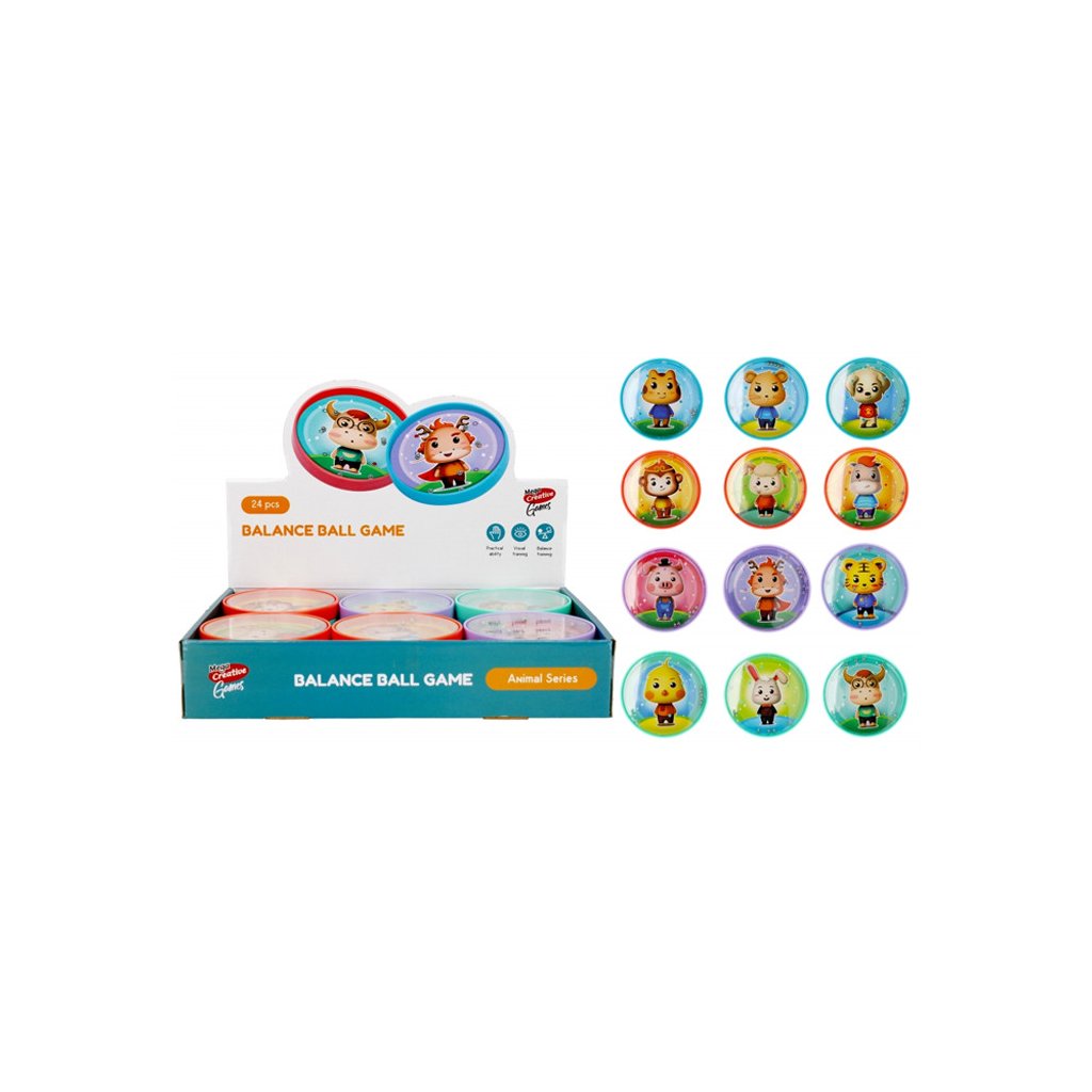 Hra balans, zahŕňa vyrovnávanie loptičiek takým spôsobom, aby sa umiestnili na určené miesto. Rozmery produktu sú 9x9x1cm. Balené v balení po 24 kusoch. Hračka je určená pre deti vo veku 3+. Rozmer (cm)