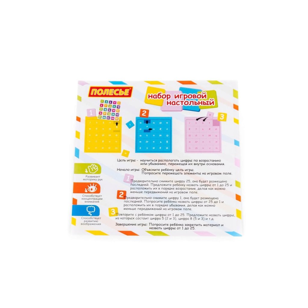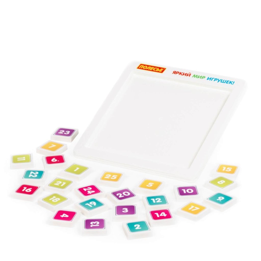 Hra čísla 25 dielikov je vzdelávacia hra, v ktorej sa deti učia zoradiť čísla vzostupne alebo zostupne ich presúvaním v rámci základne. Podporuje logické myslenie, zlepšuje jemnú motoriku a trénuje sústredenie. Sada obsahuje príbalový leták s hernými variáciami. Rozmer (cm)