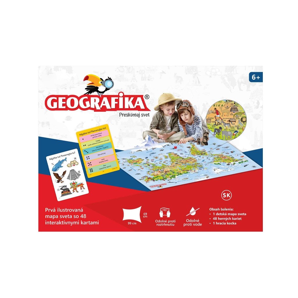 Hra Geografika, preskúmaj svet. Parádna hra, ktorá zabaví každého hráča. Prvá ilustrovaná mapa sveta so 48 interaktívnymi kartami. Hra je odolná voči vode a roztrhnutiu. SK verzia....