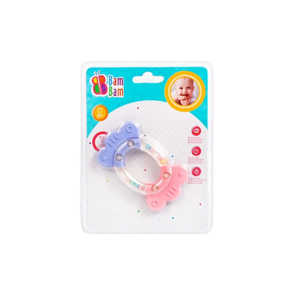 Hrkálka Bonbón pre deti od 3 mesiacov. V jemných pastelových farbách, s rôznorodou textúrou materiálov a rôznou formou má interaktívne prvky povzbudzujúce batoľa k hre a súčasne stimuluje rozvoj jeho zmyslov zraku, sluchu a motoriky. Vďaka eliptickému tvaru sa ľahko drží za malé rukoväte. Rozmer (cm)