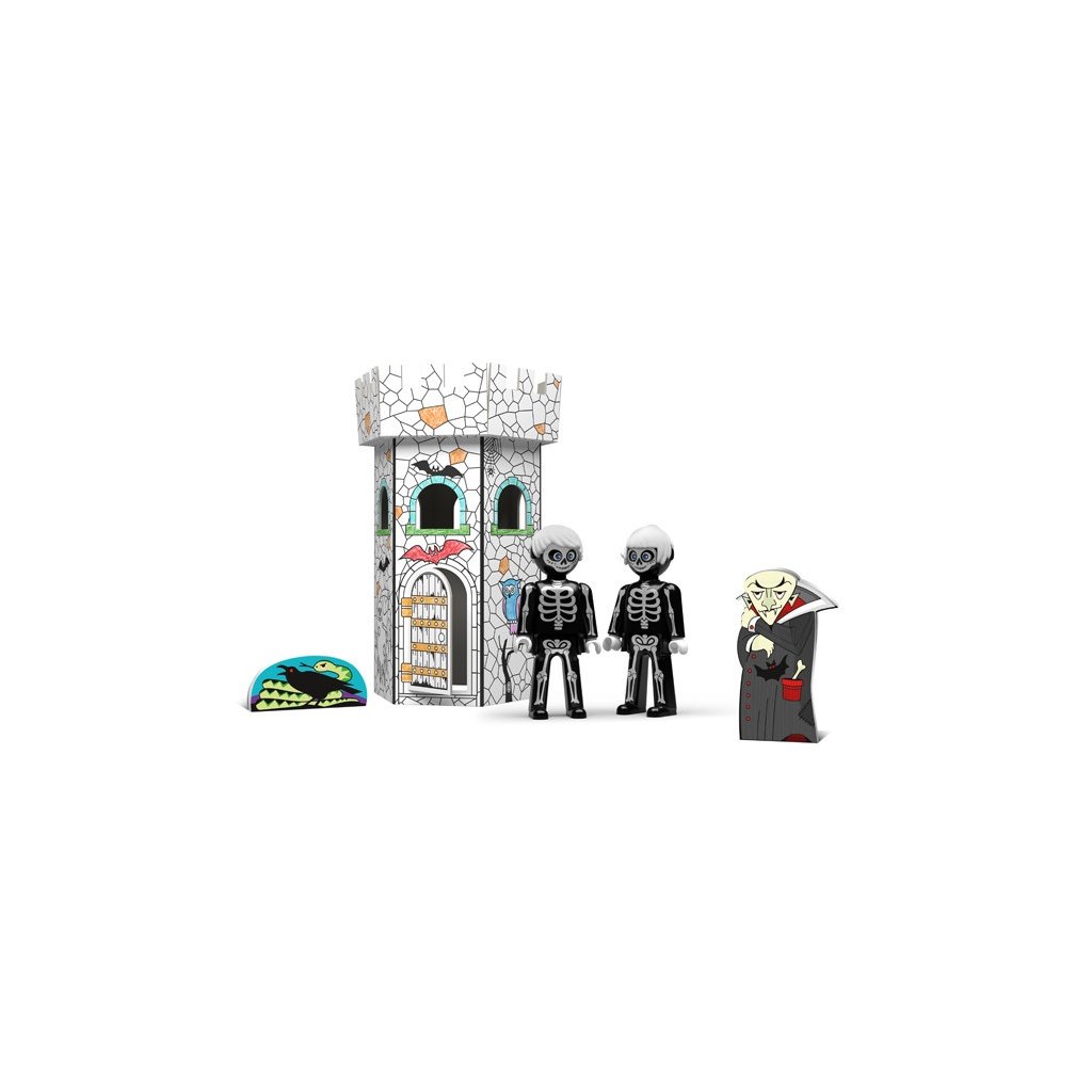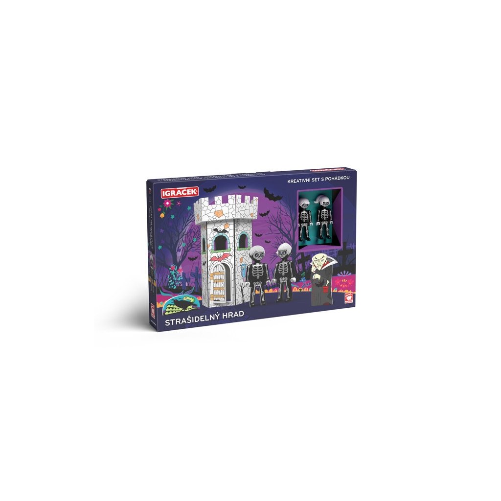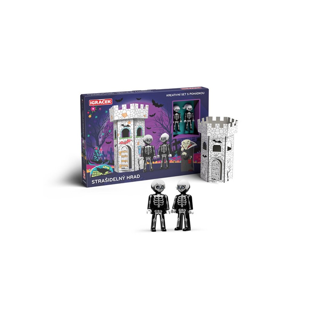 Vymaľuj, zostáv a hraj sa! Kreatívny set Igráčikov s kartónovou skladacou hradnou vežou s predtlačenými motívmi na vymaľovanie podporuje zručnosť a fantáziu detí. Set obsahuje aj dve postavičky Igráčkov Kostrieka a Kostričky a postavičku Upíra z tvrdého kartónu, s ktorými si deti môžu zahrať strašidelnú rozprávku.