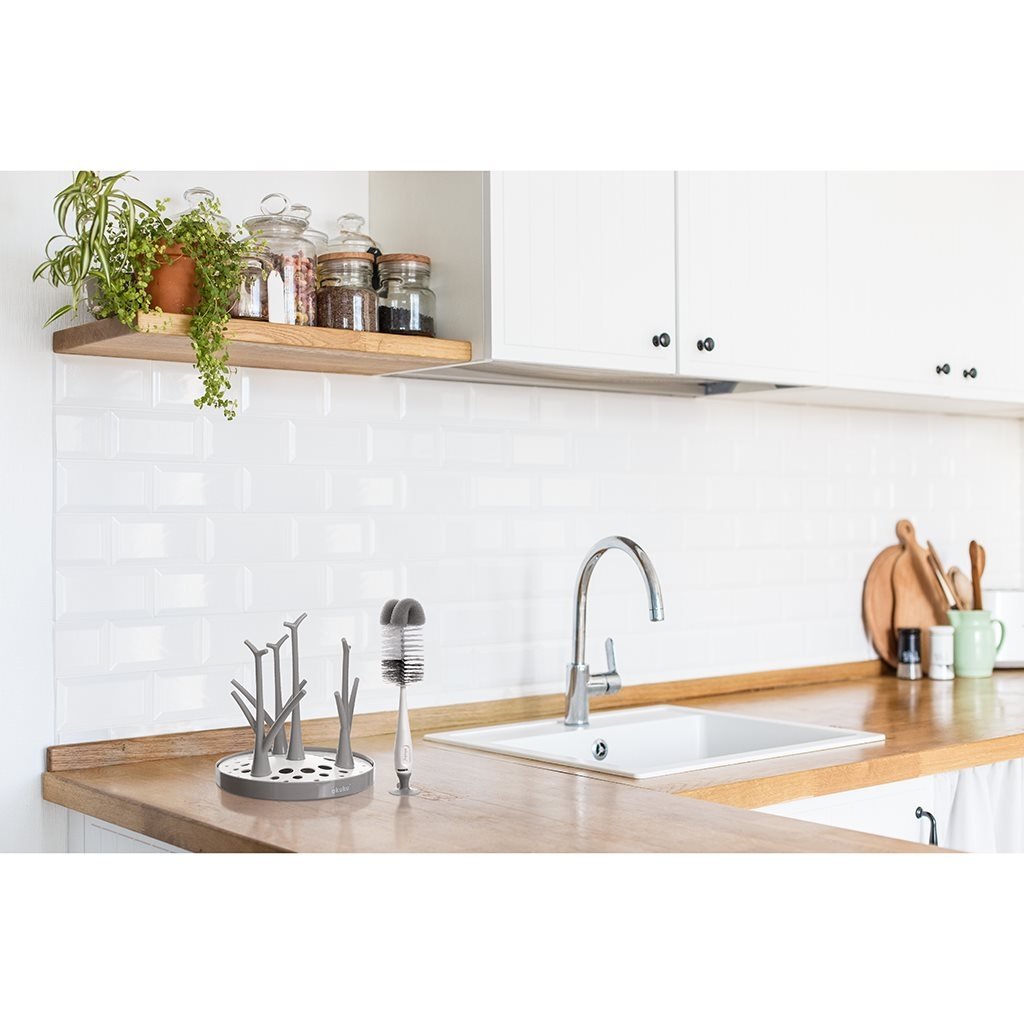 Sada dvoch špeciálne navrhnutých kefiek (veľká a malá) pre dôkladné umývanie fliaš a cumlíkov. Väčšia kefka je na konci opatrená hubkou, ktorá umožňuje ešte dôkladnejšie umytie vnútra fľaše. V rukoväti kefky je ukrytá malý kefka na cumlíky. Celá sada je zakončená prísavkou, umožňujúca pripevnenie na hladkých povrchoch.