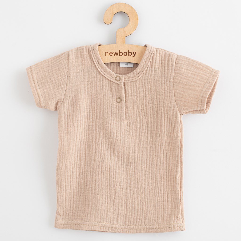Štýlová a praktická 2-dielna detská súprava New Baby. Mušelínová súpravička sa skladá z trička s krátkym rukávom a nohavíc. Veľmi praktický set pre deti v jarných aj letných dňoch. Mušelínové tričko je veľmi pohodlné už len tým, že je vyrobené z kvalitnej a priedušnej mušelínovej bavlny so zapínaním na cvočky pod krčkom. Mušelínové nohavice s moderným strihom majú praktický strih, v páse a na nohavičkách je gumička, ktorá netlačí.