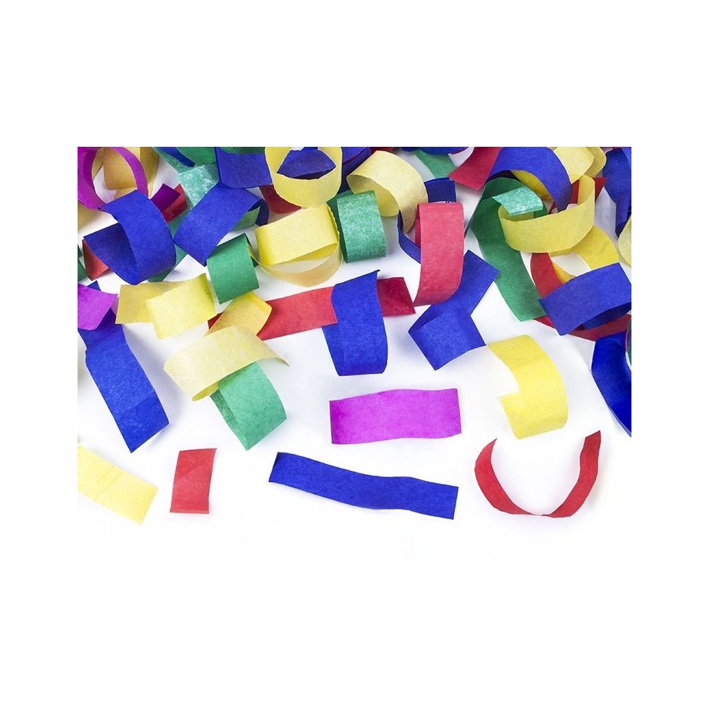 Konfety 20 cm, farebné papierové prúžky. Konfety sú uložené vo valcovitej tube. Držia sa v ruke a ovládajú sa mechanickým pootočením tubusu. Po vystrelení vyletia farebné papierové ...
