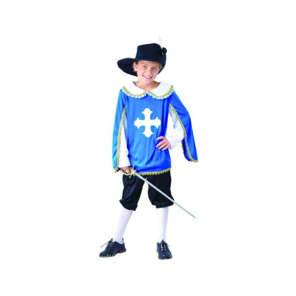 Karnevalový kostým mušketiera pre chlapcov, vhodný na karnevaly a školské vystúpenia. Balenie obsahuje klobúk, plášť a nohavice. Určené pre deti s výškou 120–130 cm....