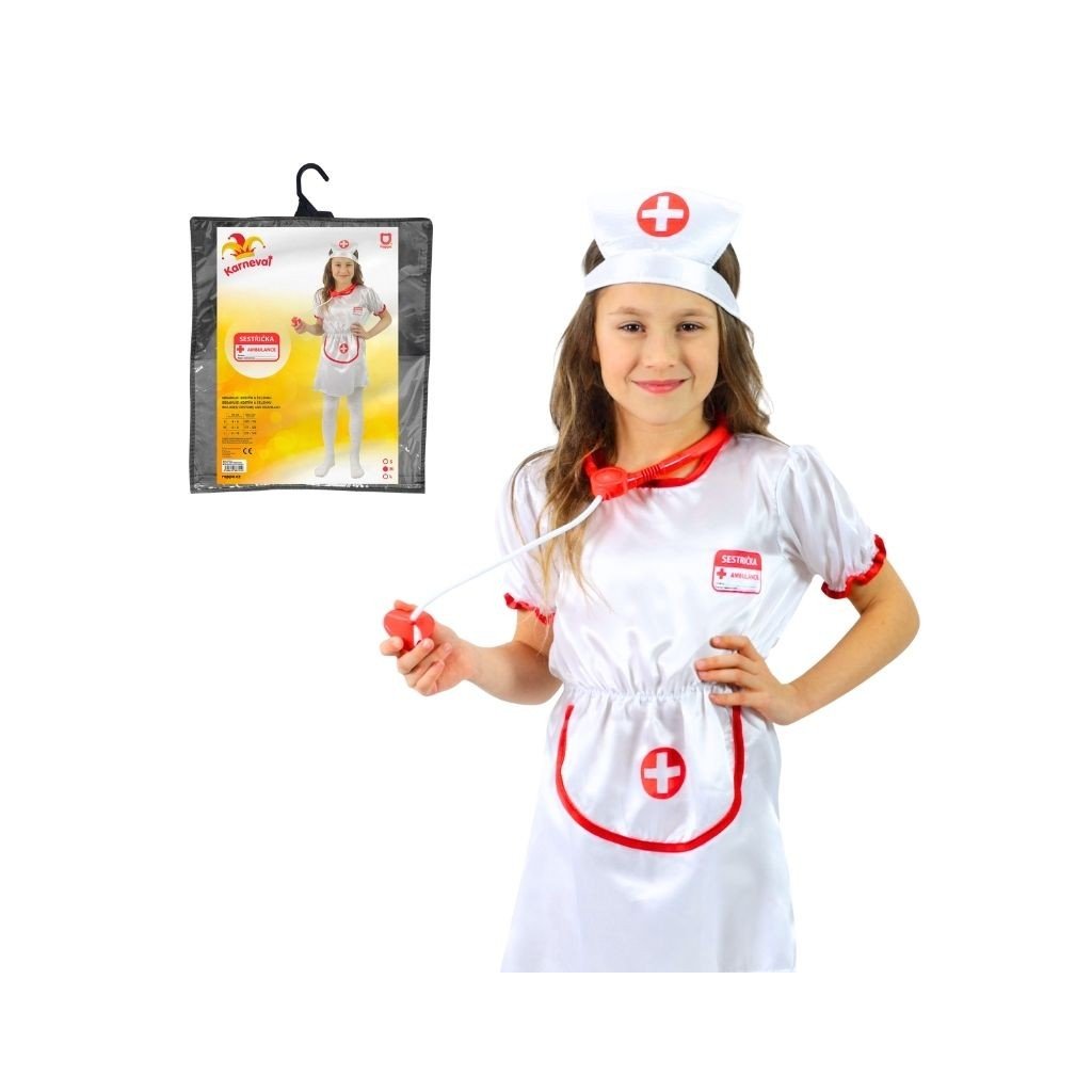 Krásny karnevalový kostým pre malé zdravotné sestričky. Kostým veľkosti M je určený pre dievčatá vo vekovom rozmedzí 6-8 rokov 117-128 cm. Sada obsahuje šaty a čiapku. Stetoskop nie je súčasťou balenia. Rozmer (cm)