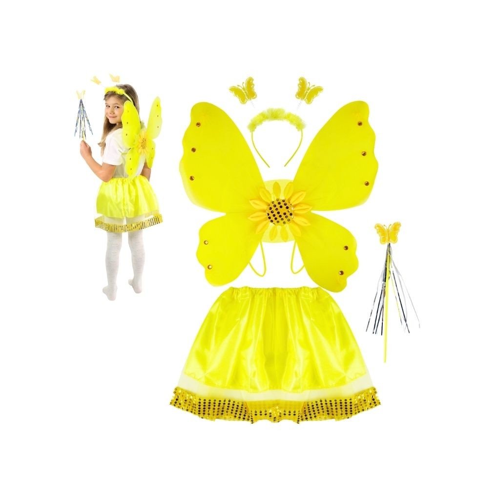 Kostým víla Slnečnica je určený pre dievčatá vo vekovom rozmedzí 3-10 rokov. Balenie obsahuje nadýchanú sukienku, ktorá je v spodnej časti lemovaná zlatými flitrami, krídla so slnečnicou a ozdobnými kamienkami, čelenku s metalickými motýliky a k tomu prútik. Rozmer (cm)